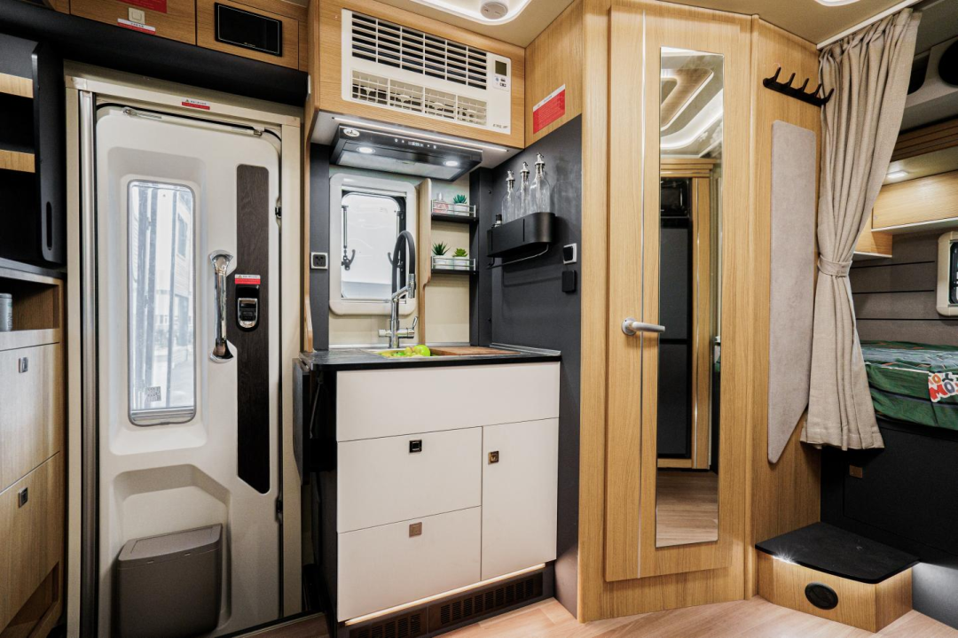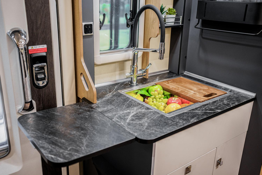 车身左侧、尾部设置了两处拓展舱,空间表现比一般的C型房车更出色。驻车后打开双拓展舱,车内会客厅和尾横床的空间会扩大,可以容纳更多人休息。