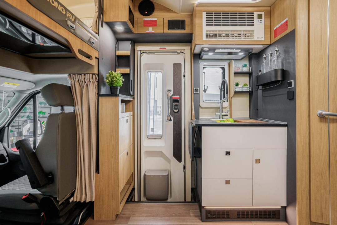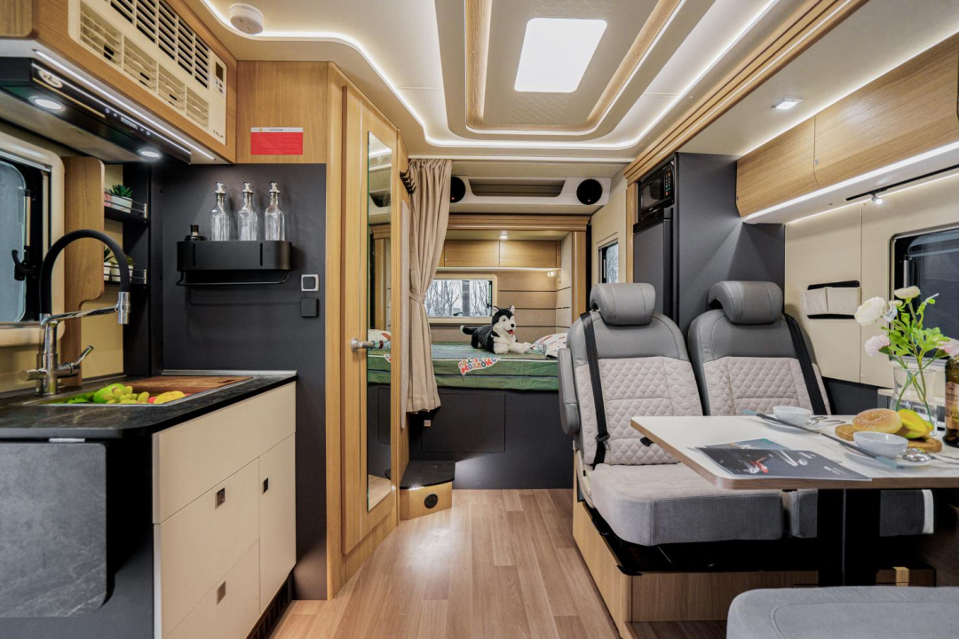 澳洲胡桃木新内饰风格的设计,奢而不华,品位不凡,让整个空间更有质感,另外也可以选装马拉加樱桃木新内饰风格;照明方面设有造型吸顶灯,和照明灯、氛围灯提供照明;暖风、热水系统配有燃油加热器、生活区散热器、换热式热水器、直流变频空调等。