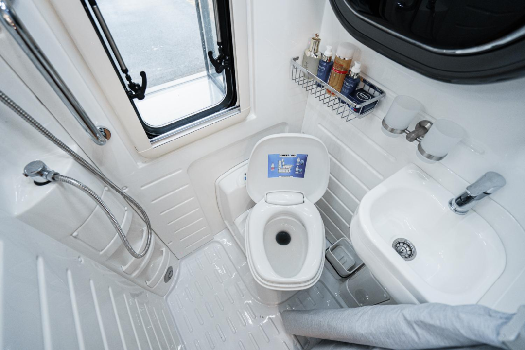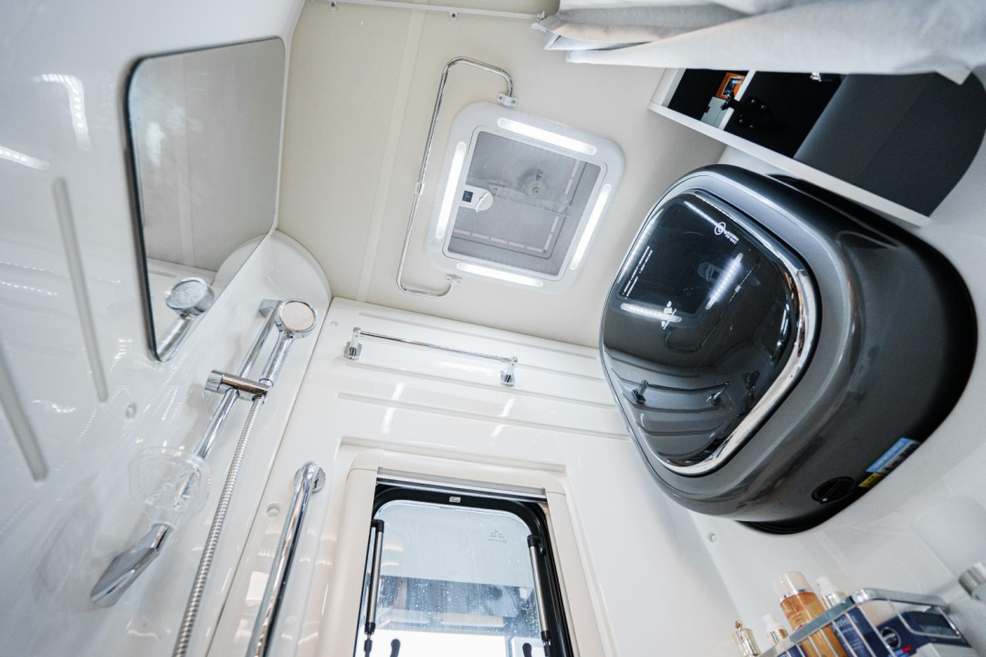 干湿一体式卫浴区配备了淋浴花洒、毛巾架、浴室镜、卫浴帘、洗手池、晾衣杆、穿衣镜、扶手、置物架等,卫浴、洗漱设施非常齐全;内部还有一台3kg洗烘一体机,解决旅行的洗衣问题。