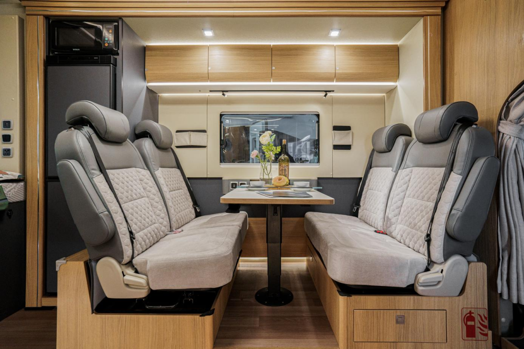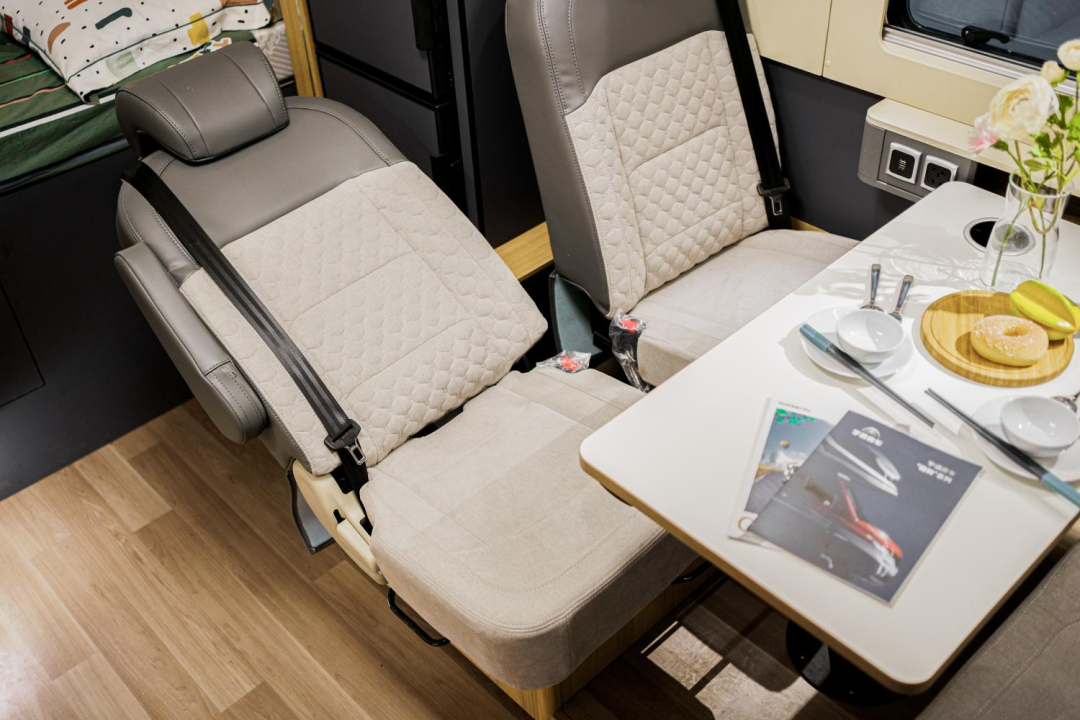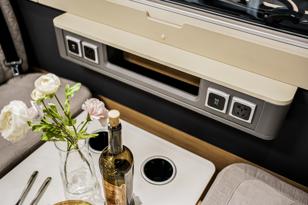 得益于左拓展舱的设计,会客区拥有了更大空间,内部设置了乘坐空间更丰富的双人对坐商务座椅,座椅都配备了安全带,行车时可以乘坐更多人;卡座中间是气动升降餐桌,可以作为办公、就餐区使用。