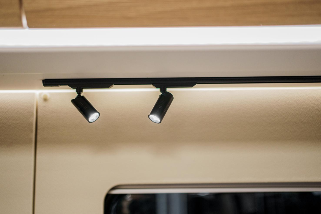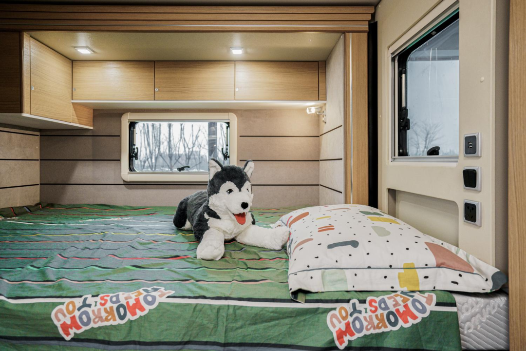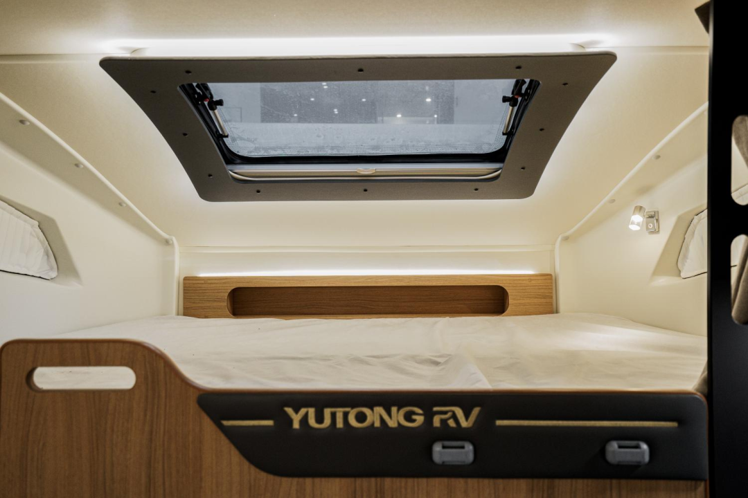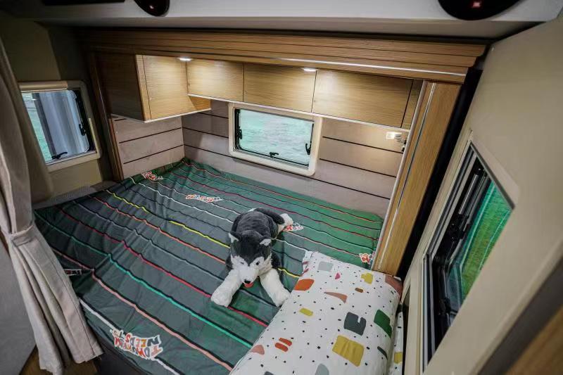 尾横床可拓展,拓展后尺寸为2210x1360mm,侧面阅读灯、电源插座、USB接口、车窗配备齐全,营造舒适的睡眠空间;顶部还有一排吊柜,提供充足的储物空间。