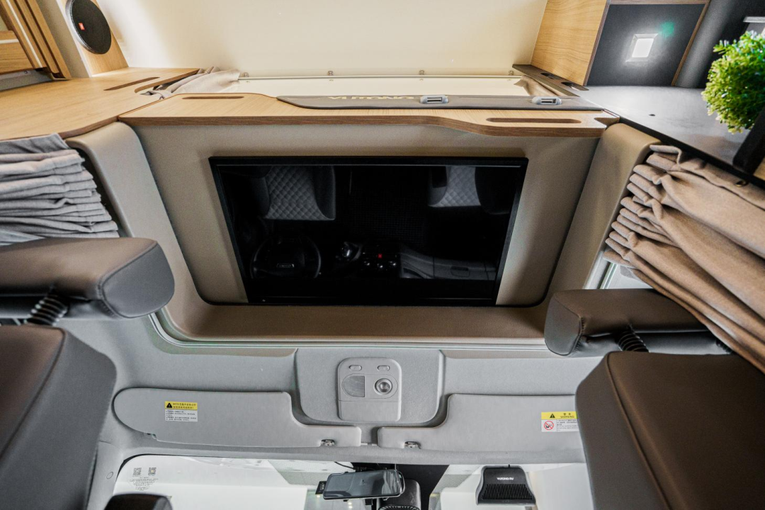 额头休息区的尺寸约2200x1390mm,休息空间非常丰富;生活设施设置了天窗、照明灯、侧车窗,侧面还设置了隐私帘保证睡眠空间的私密性。