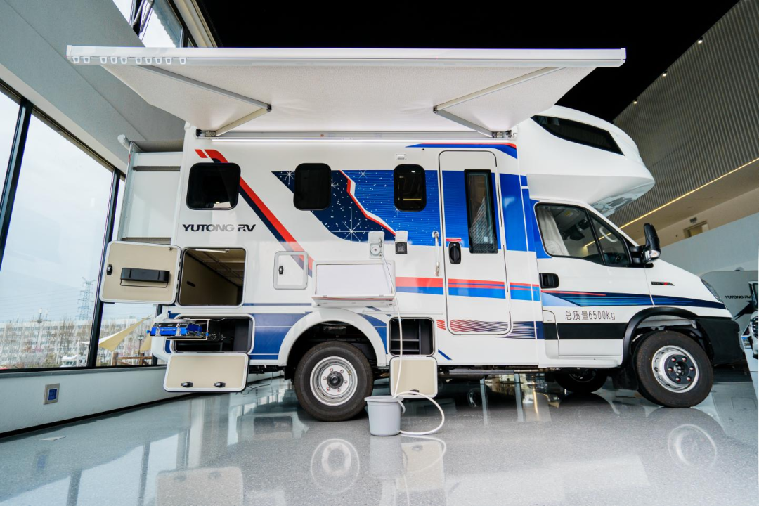 车身外侧在配备电动遮阳蓬(选装)、电动踏步、上车扶手等户外设施的同时,还配有智能限高监测系统,可以提供前向限高预警,保证行车安全;用水方面配备了房车自吸泵,打破了传统重力加水的方式,可以随时随地补充水源,充电可以使用市电、交流充电桩两种方式,为补充电力提供了便利性。