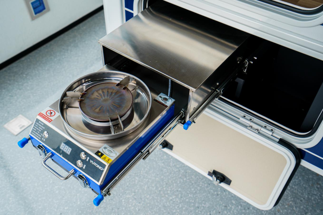 尾部是大容量贯通式储物舱,储物空间达到了1030L,可以放下户外桌椅、渔具;下方是抽拉式柴油灶(选装),侧面还有置物的折叠桌板,户外烹饪时可以放置食材。