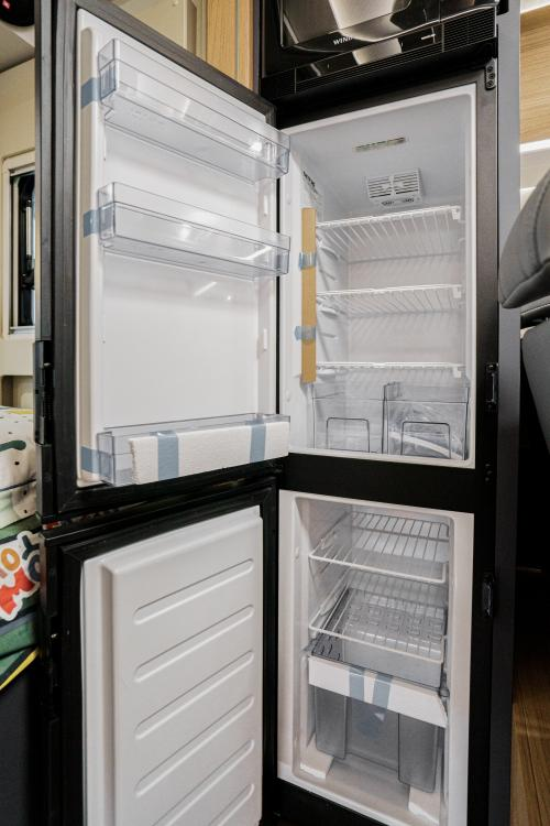 卡座后方是一台142L进口房车专用冰箱,设置了冷冻区和冷藏区,可以分区存放不同的食材,冰箱上方还有一台微波炉,用来快速加热食物。