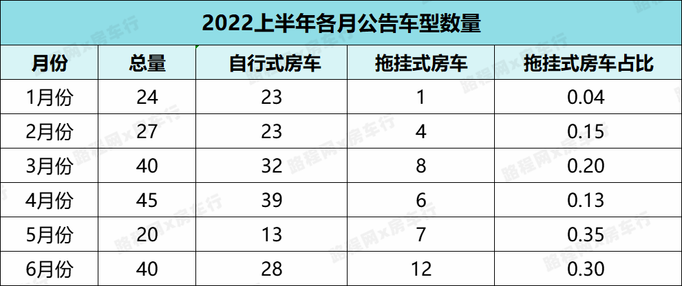 另外在数据对比中,我们发现,虽然申报车型《公告》中,拖挂房车的数量占比相较往年下降不少,从2021年的占比25%减少至19%,但数量锐减主要集中在第一季度(占比14%),第二季度占比达到24%,背后原因或与4月1日C6驾照正式实行,拖挂房车厂家持观望状态有关;其中,拖挂房车单月占比最高为5月的35%,6月以30%的占比次之,占比最低为1月份,只有一款拖挂房车,占比4%;由此可见,虽然C6驾照的实行短期内对拖挂房车行业造成一定影响,但从长远来看是利大于弊的。