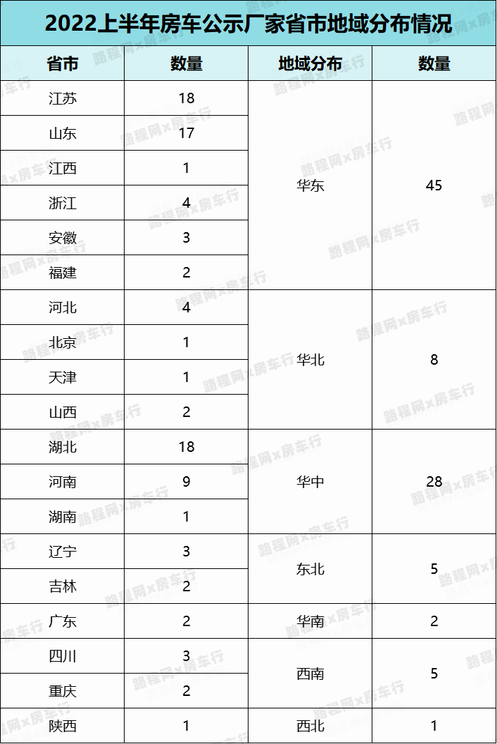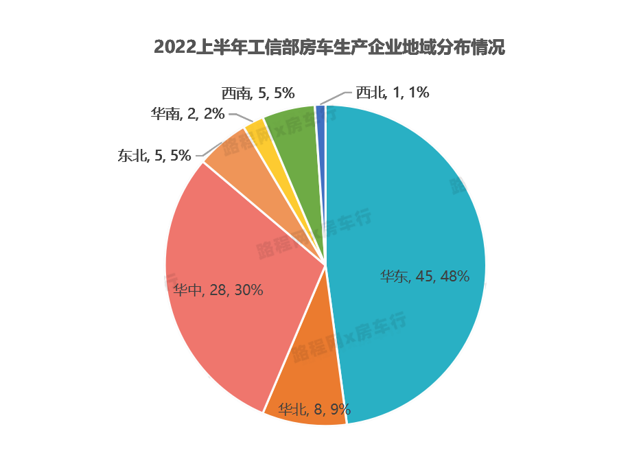 而在房车厂家的地域分布特征上,2022上半年,以江苏、山东为代表的华东地区(申报45款房车,占比48%);以湖北、河南为代表的华中地区(申报28款房车,占比30%)是房车厂家生产制造的主要阵地。