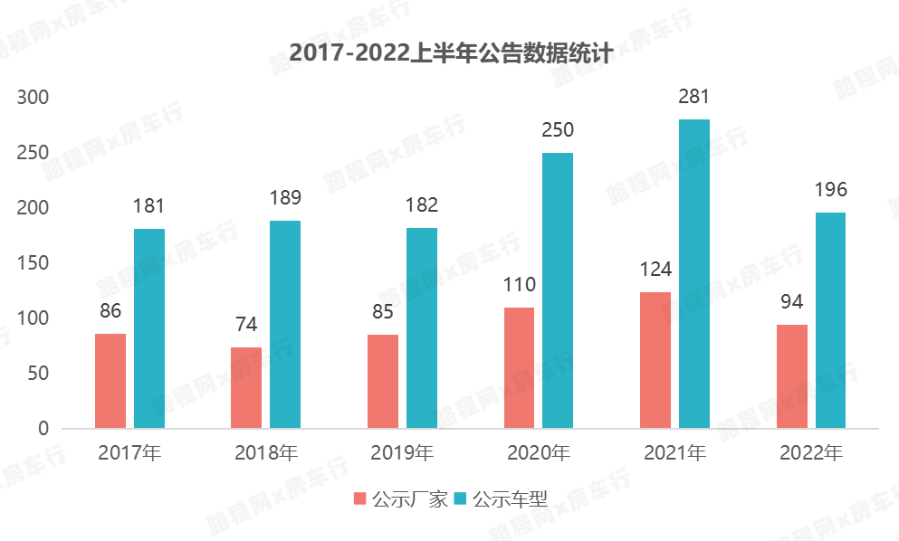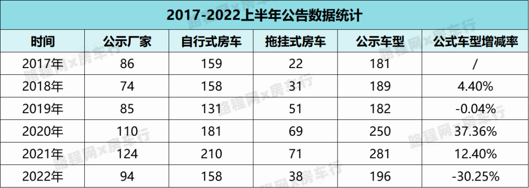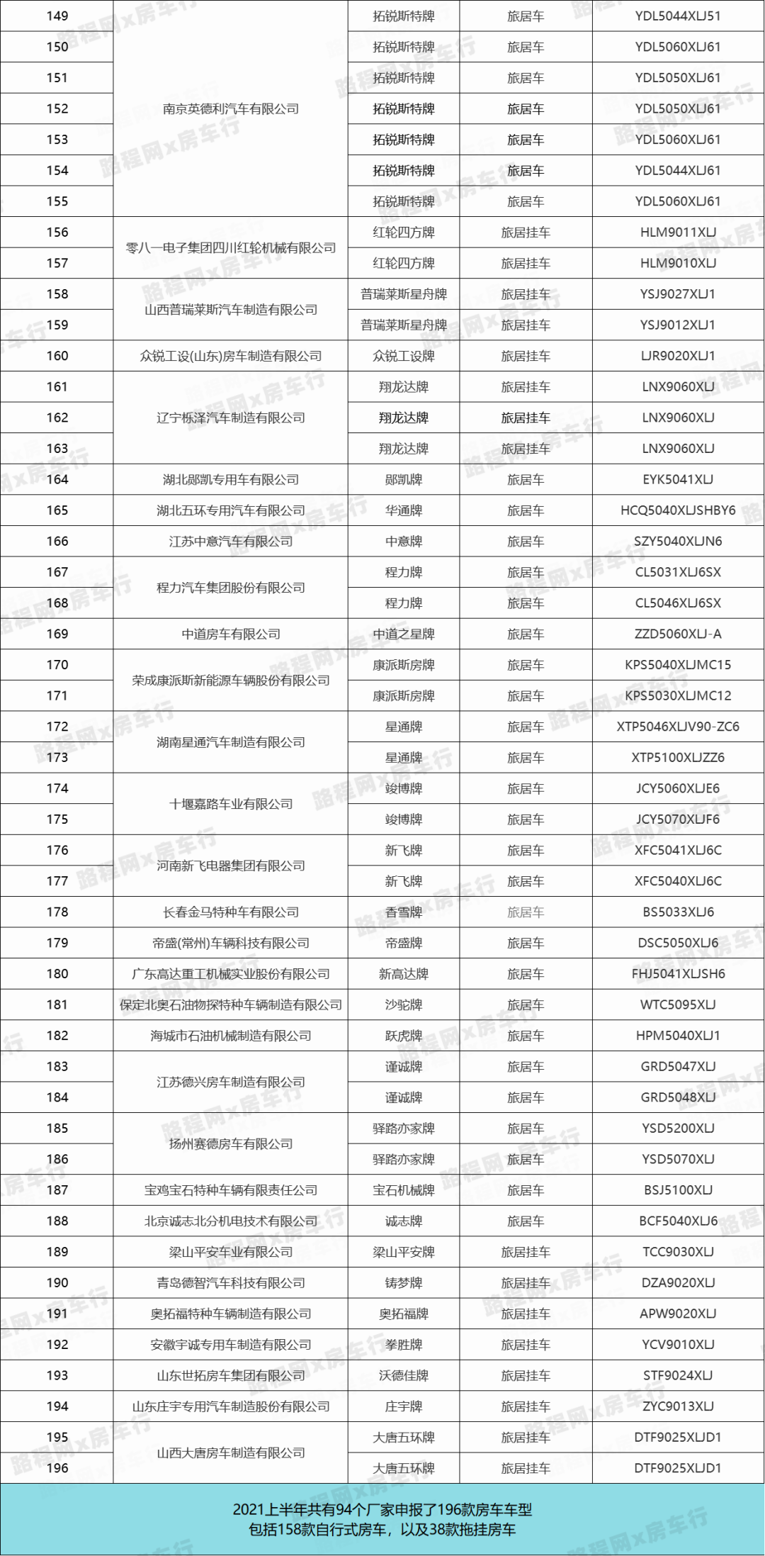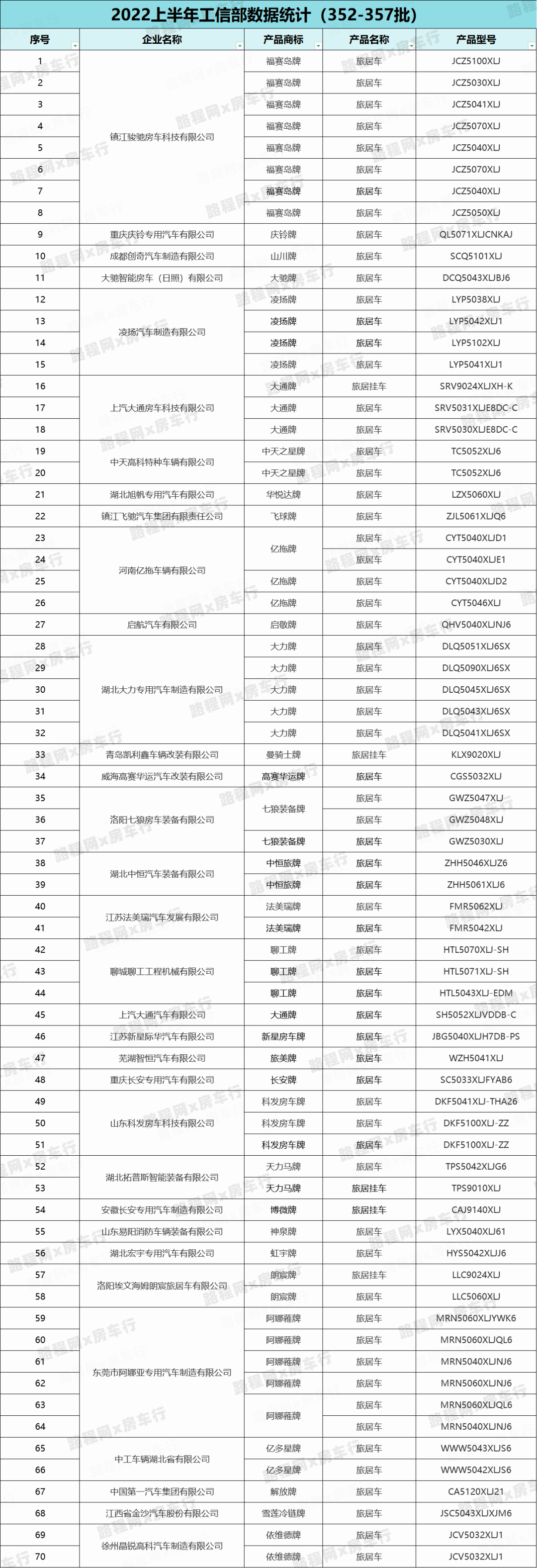 即将到来的七月,正悄悄拉开2022下半年的序幕;在过去的半年时间里,国家工业和信息化部公示了六批《道路机动车辆生产企业及产品公告》,包括第352批、353批、354批、355批、356批及357批在内,上半年共有94家房车厂家申报了196款新车,其中自行式房车158款,拖挂式房车38款。