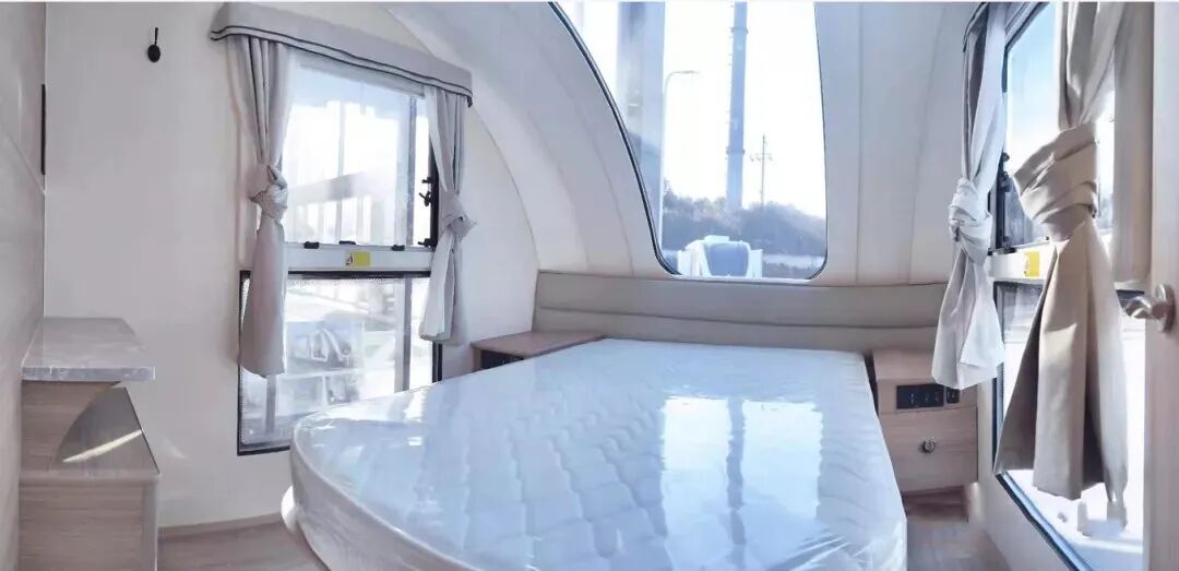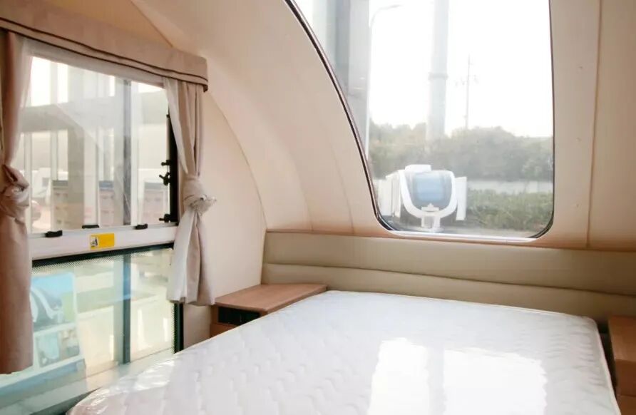 车头位置的休息区配有一张标准双人床,睡下两名成年人没有任何压力;内部空间非常宽阔,同时搭配有衣柜、两个床头柜,可以存放衣物和日常生活用品;双人床尾部配有可供两人同时使用的小餐桌;除此之外,休息区左右两侧分别配有可打开的落地窗,还有超大天窗从车头顶部一直延伸至床头处,视野更加开阔;