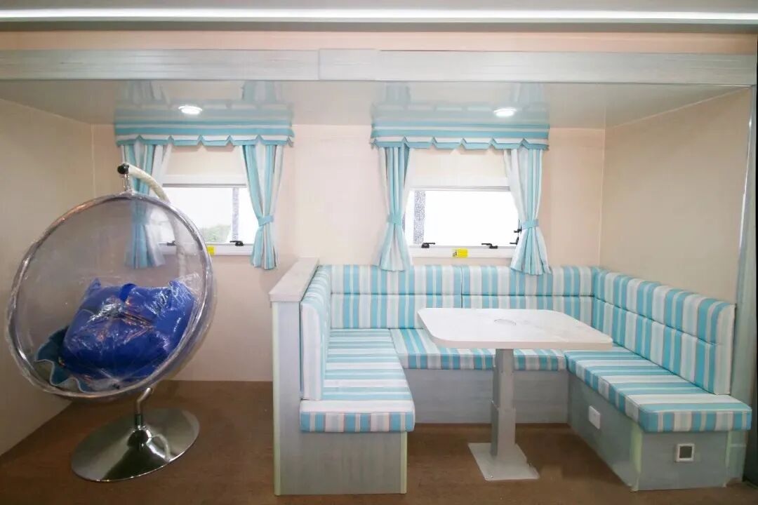 头部位置的休息区配有豪华双人床,左右两侧配有外推落地窗,顶部还有超大天窗;内饰风格方面有浅色温馨与地中海等多种风格可选择;休息区同时配有窗帘,可用于隔断空间,对个人隐私起到良好的保护效果;