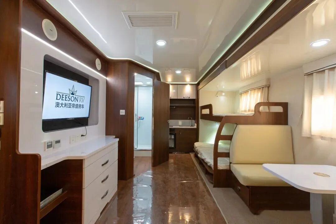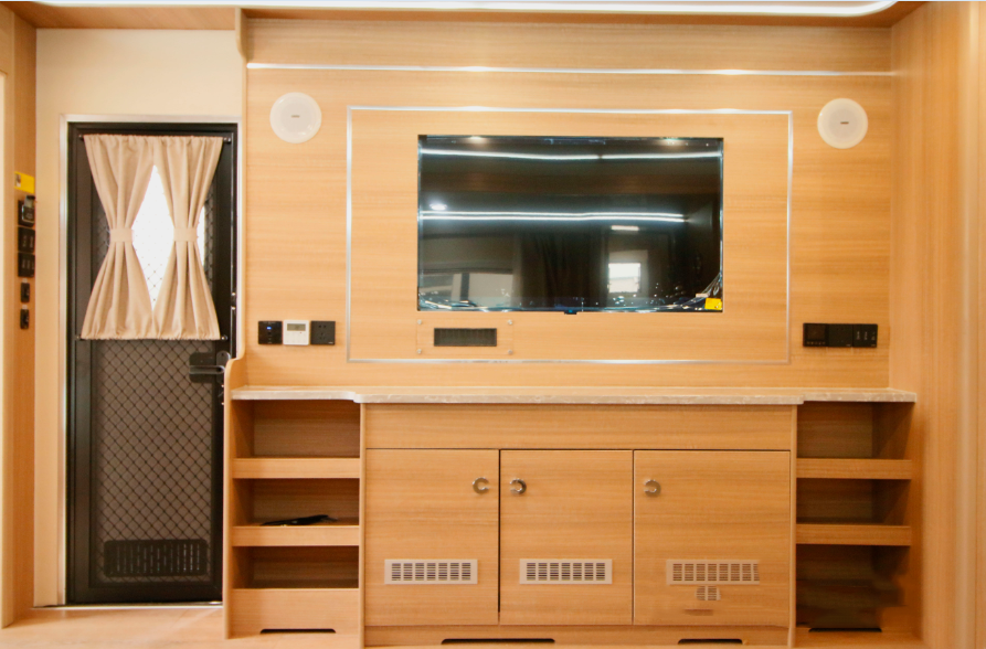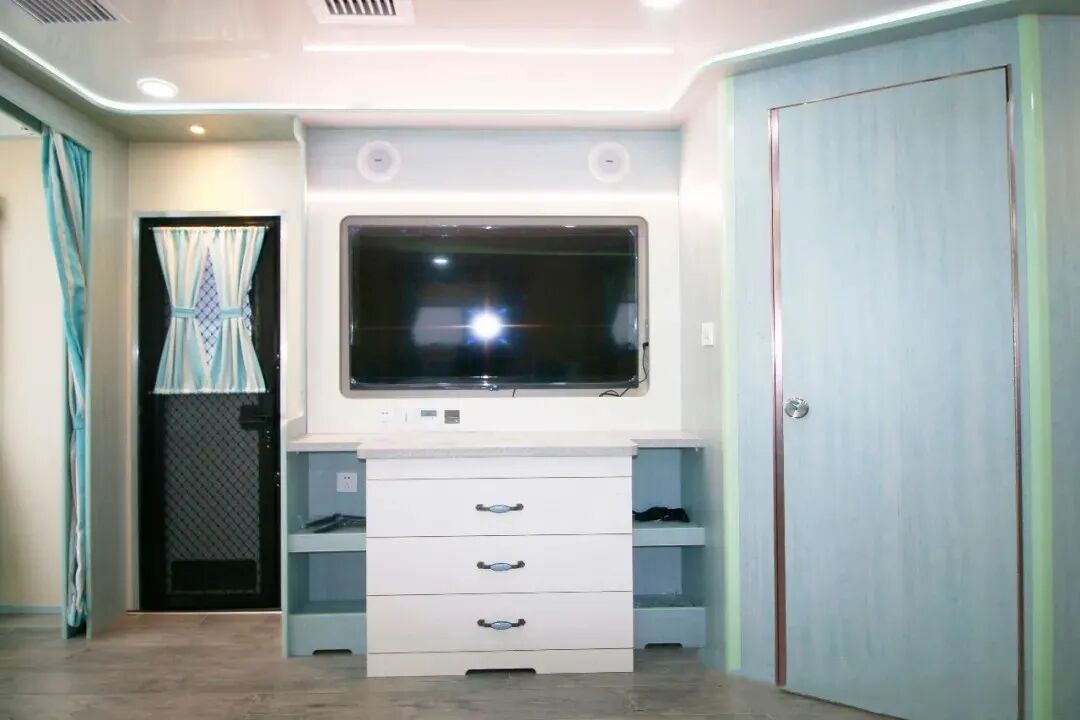 车身内部右侧设有组合电视柜、车载智能电视等,充分满足影音娱乐的需求;下方装配储物柜,方便日常存放物品;