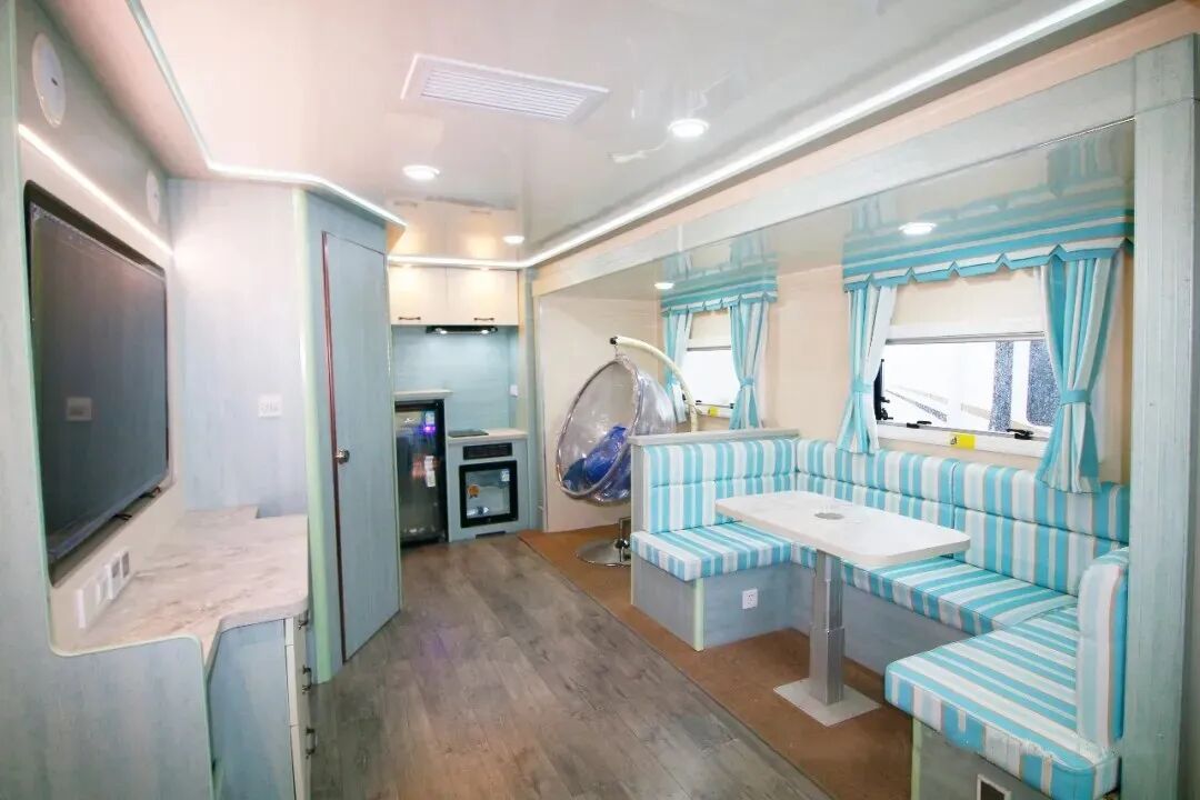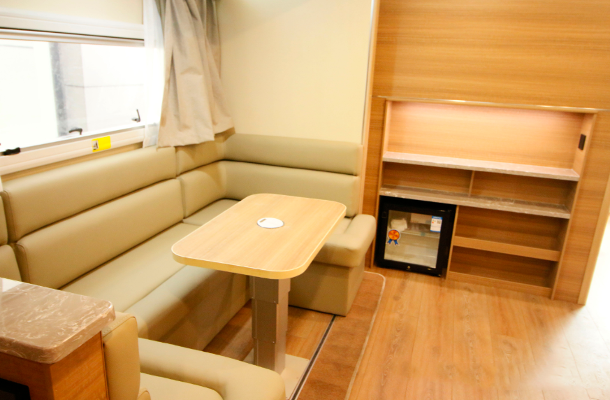 会客区配置的有车载电视、卡座、储物柜、可升降式餐桌等多种设施;沙发可根据个人需求选择U型沙发或对座式;同时,如果你不想要上下铺的话,还有网红座椅可供选择;