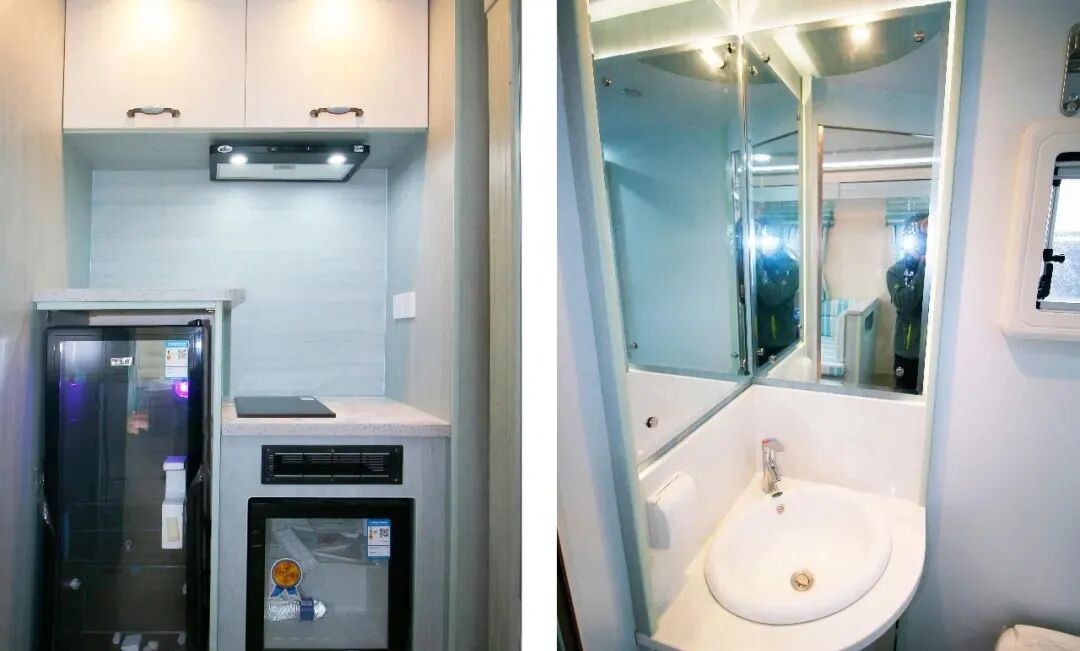 卫浴区在车辆内部侧后方位置,干湿分离式设计,内部独立花洒、洗漱台、浴镜、浴架、浴柜、车载马桶等设施配置齐全;尾部厨房区配有电磁炉、冰箱、组合橱柜等,可满足日常烹饪需求。
