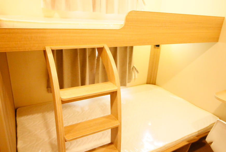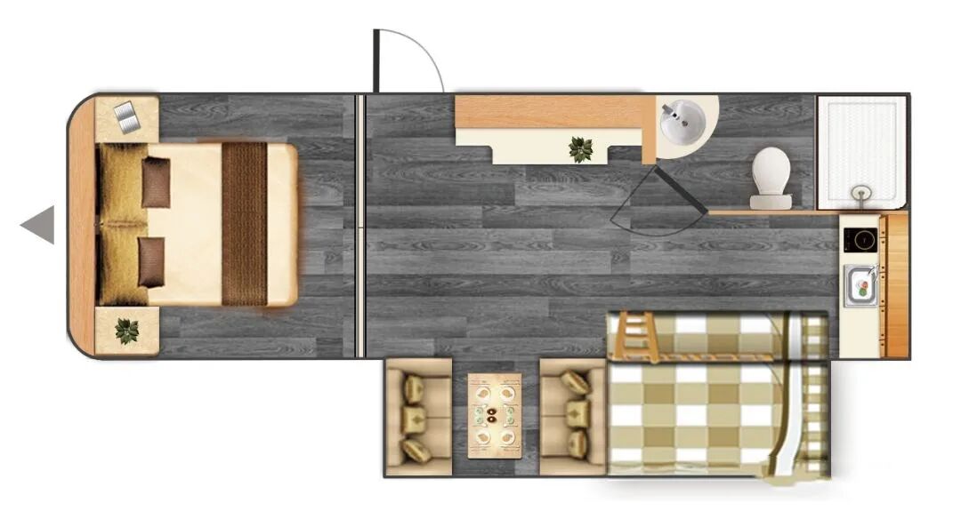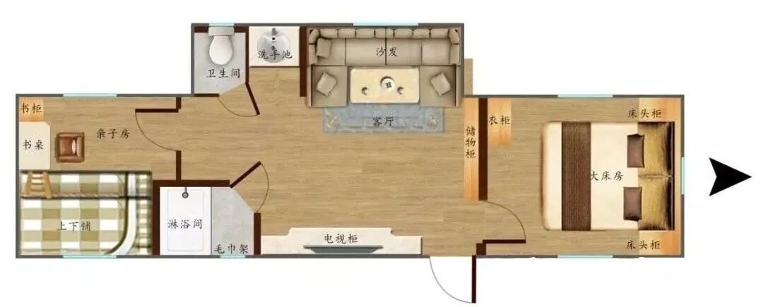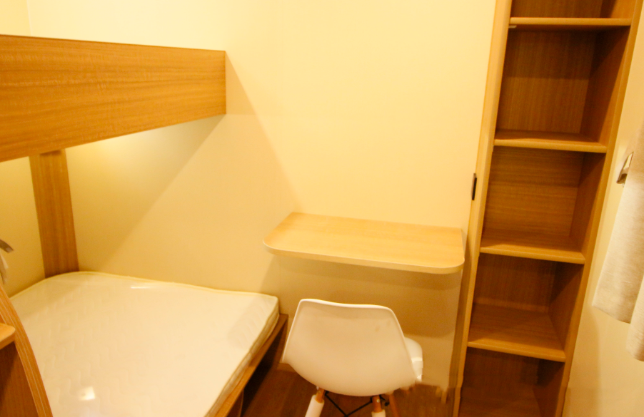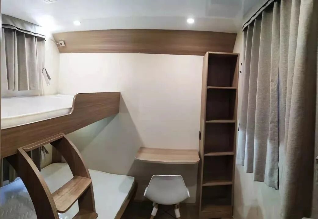 尾部亲子间配有上下铺,同时搭载书桌、书柜等,日常用来学习、工作都是不错的选择;