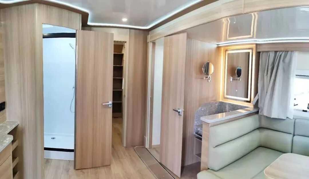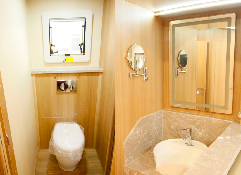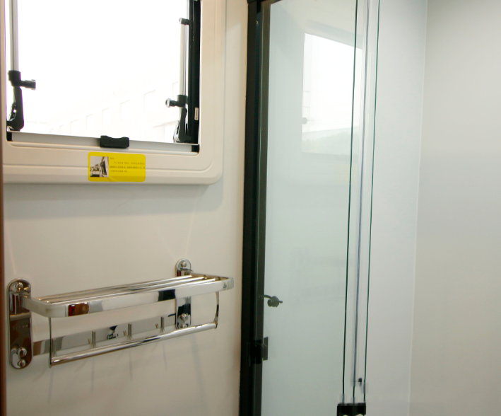 卫生间、洗漱池位于车身左侧区域,卫生间为封闭式,与洗漱池分隔开来;洗浴室则在车身右侧区域,干湿分离式设计,左侧毛巾架可用来放置衣物,右侧为洗澡区域,毛巾架与洗浴区之间设有玻璃门,可以有效防止水溅到外面;