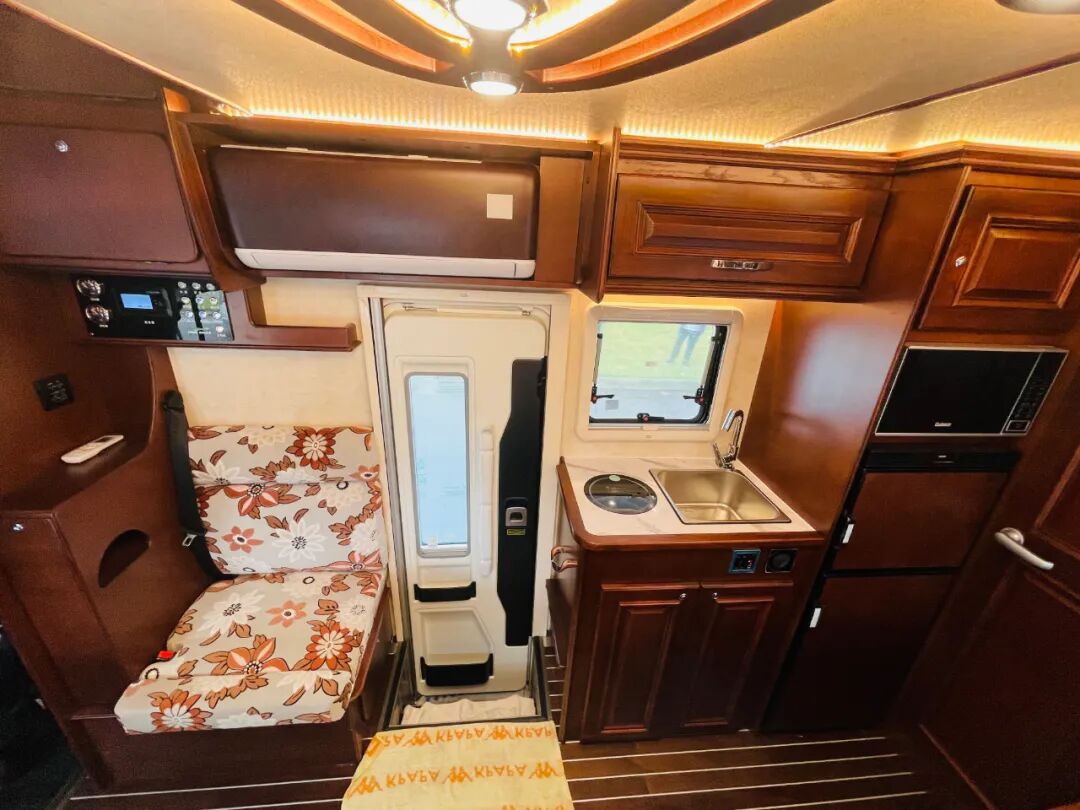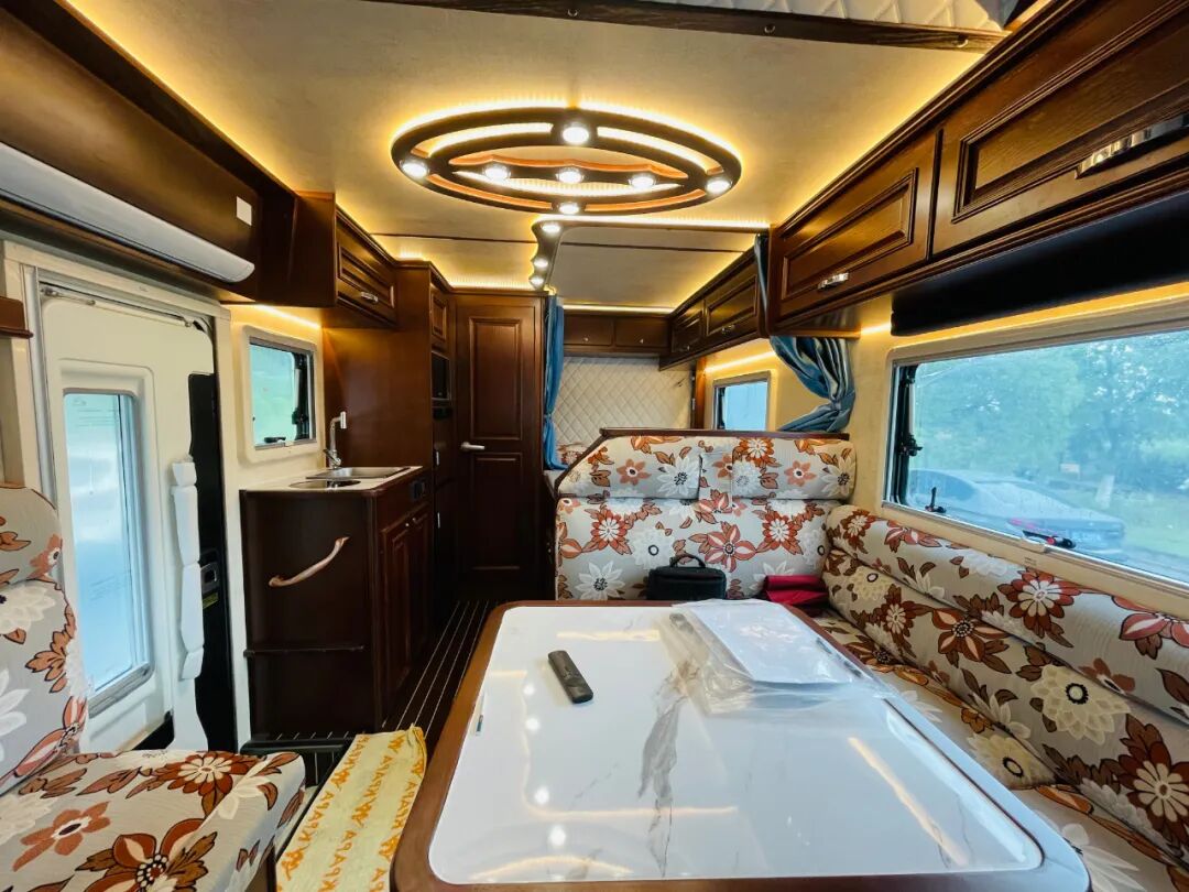 生活空间依次设有额头休息区、会客区、厨房区、尾部休息区、卫浴区,生活功能配备齐全,可以满足一家四口户外旅行生活;内饰采用实木复古家具,结实耐用,健康环保,搭配顶部吸顶灯、氛围灯、LED射灯照明,打造典雅温馨的生活空间。