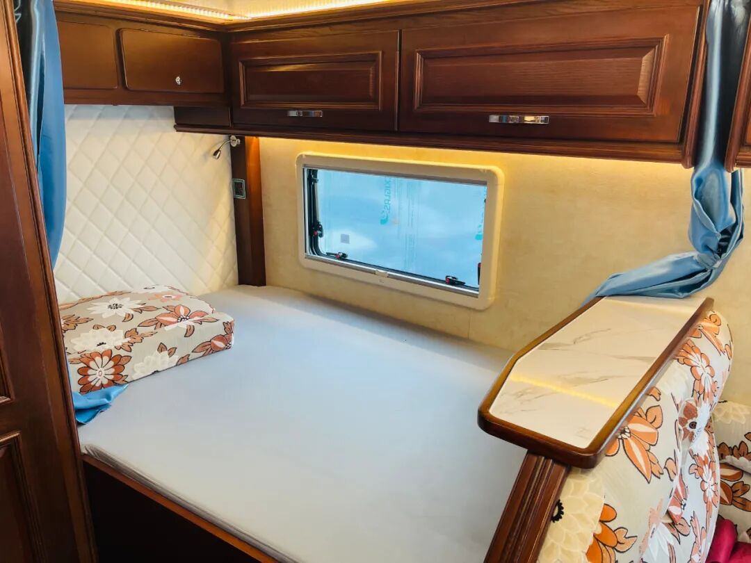 尾部休息区纵置双人床,尺寸为1900x1200mm,并且经过软包处理,睡眠更舒适;侧面车窗、照明灯、电源插座、隐私帘配备齐全,满足睡眠休需所需;顶部是L型设置的吊柜,足以收纳日常衣物用品。