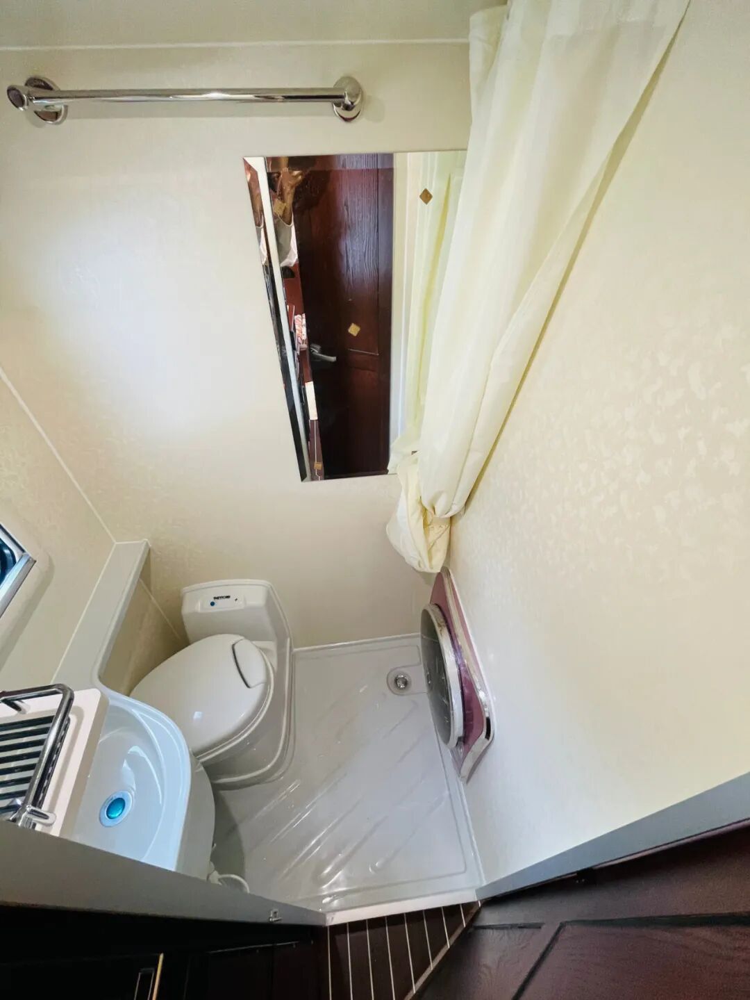 干湿一体式设计卫生间配有赛特福德盒式马桶、洗手池、淋浴花洒、置物架、化妆镜、浴帘等,满足户外旅行卫浴、洗漱需求;洗手池对侧还内嵌了一台烘洗一体机,解决了洗衣的问题。