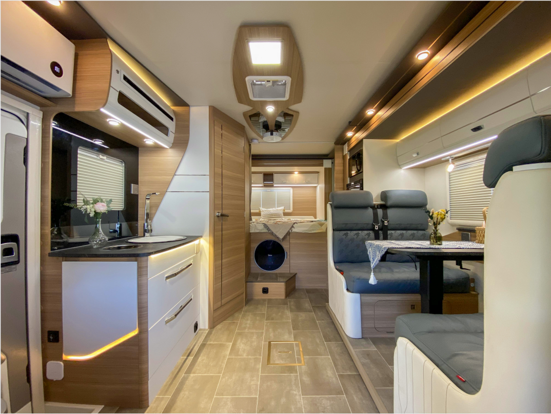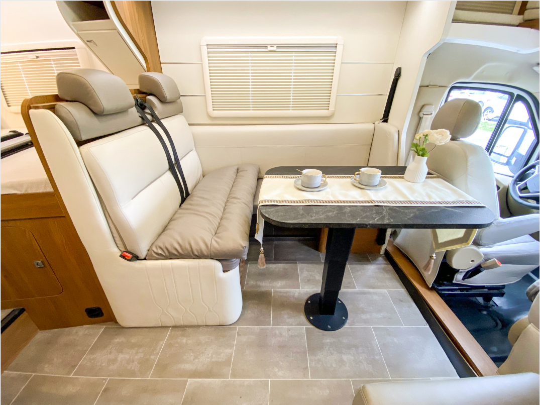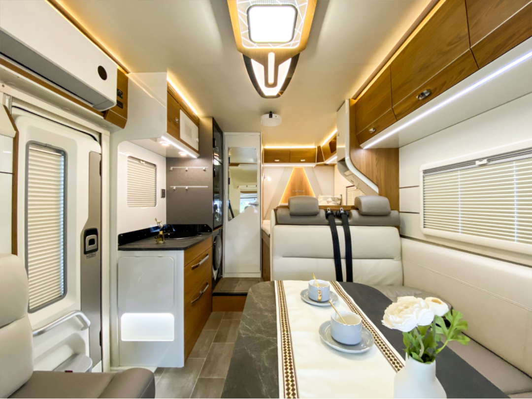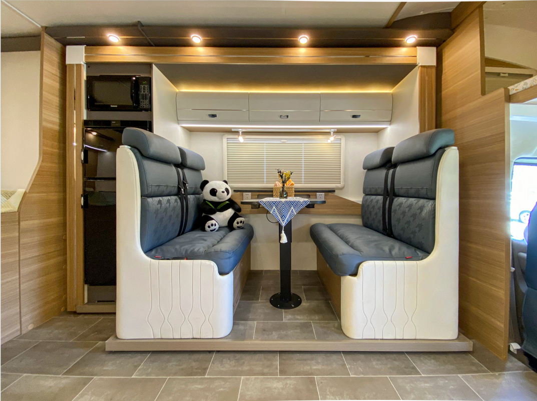 全新图整体车身采用轻奢家装内饰风格,加入线条、金属等极具张力元素,木材的天然质感与肌理活灵活现、轻质环保家具板材、卡座座椅质感舒适、造型美观等多项优点,让你的房车之旅,如同置身居家生活之中,更加典雅、舒适、温馨。