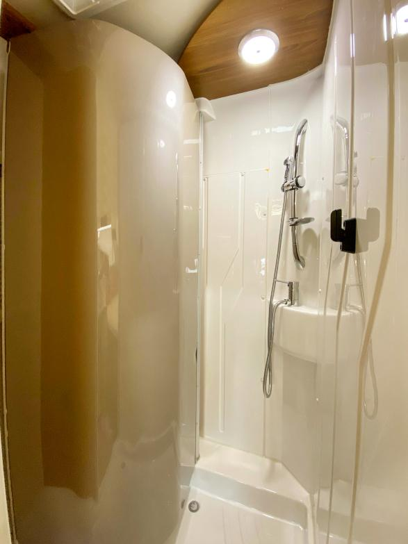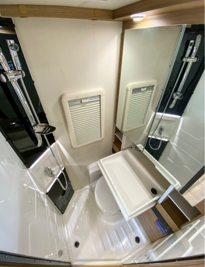 卫生间采用ABS一体式防水材料,空间充足,车内卫生间空间不显局促,一人使用时空间非常富裕,内配镜柜、隐藏式洗手盆、淋浴花洒、盒式马桶等,整体美观易打理,精细化防水防腐。另外此款房车在水路系统装配有185L净水箱+50L灰水箱,可以满足旅居生活中的日常使用。