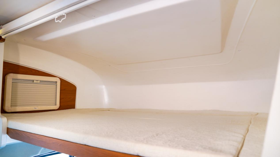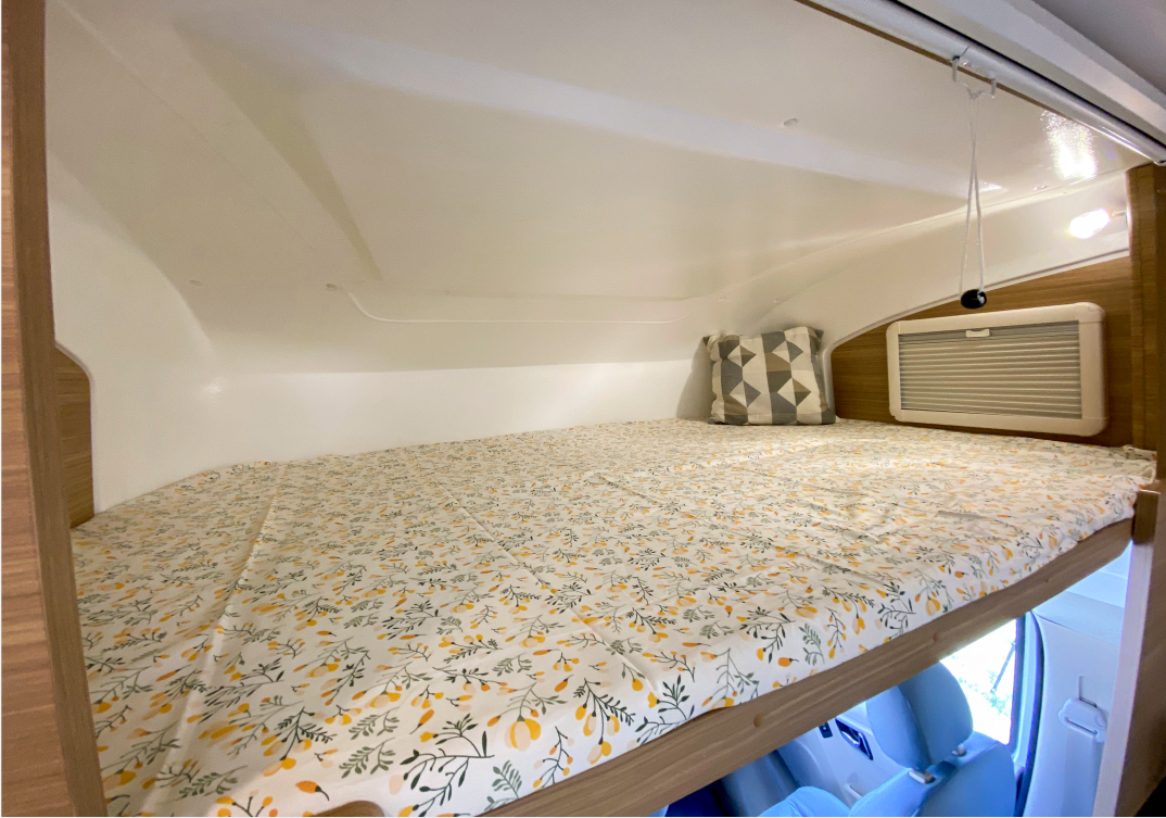 车头顶部标配带爬梯可推拉的双人额头床,床铺两侧均设有通风换气窗,可实时保持车内空气干净清爽。床板下方可选配60寸的投影幕布,为平日的休闲生活提供了娱乐需求。