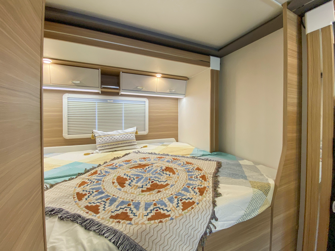 位于车尾后拓展区的双人床,拓展后,双人床面积超大,可容纳2-3人使用,两侧与后方还均加装加大通风换气窗,保证此处的采光与通风效果。上方还设有储物柜,满足一家人出行的储物空间。