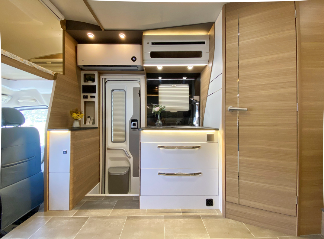 客厅右手边为储存柜和室内厨房,储存柜上方是全车智能触控操作台。双拓版房车配有室内外两种厨房,外拓厨房+室内电磁炉,可根据不同环境,不同天气选择使用。车内厨房除了配置电磁炉外还配有洗菜池、水龙头、电磁炉与厨具储物柜等等,一应设施配套齐全。