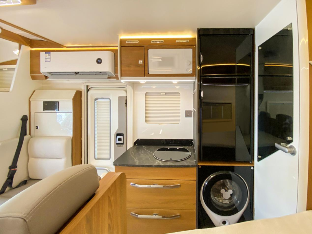 厨房区域配备了日常所需的双开门的房车专用冰箱、翻盖式水槽、微波炉、嵌入式洗衣机等,完全满足旅行途中生活所需。