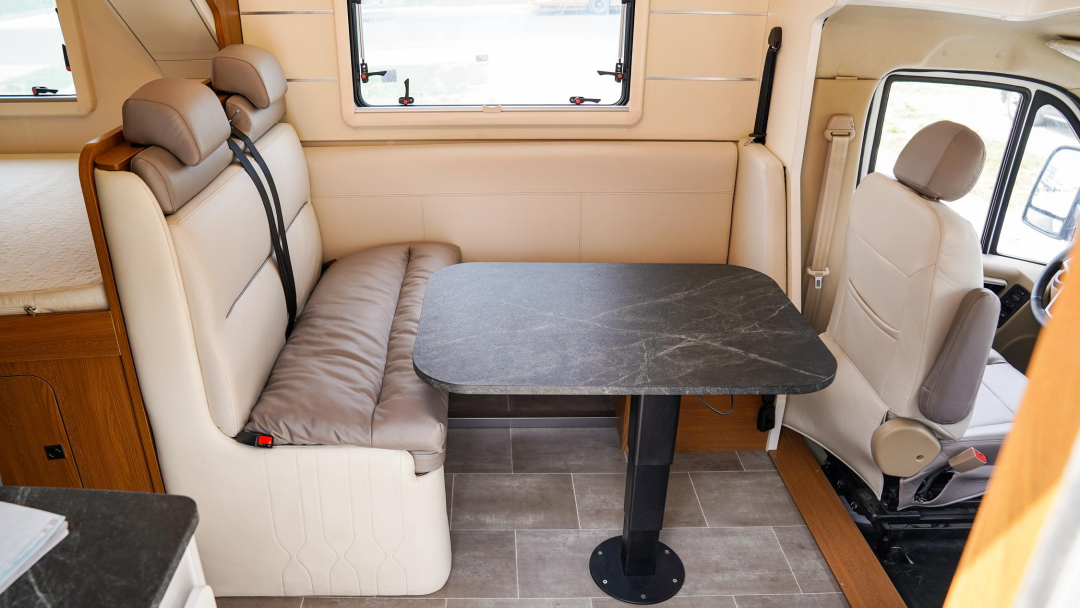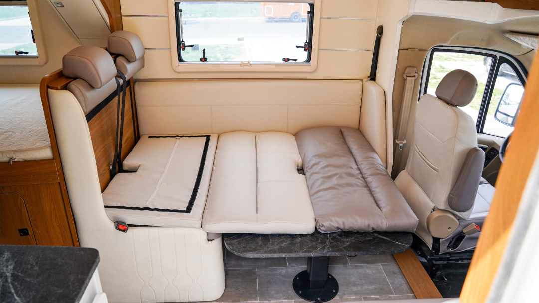 额头窗后方左侧是室内客厅:客厅配有L型卡座沙发+单人沙发,卡座沙发中间是可升降式岩板餐桌,车内客厅的卡座与沙发在夜晚可拼接成沙发床,客厅上方吊装有一组储物柜,可放置轻便物品,如衣物与食物等。