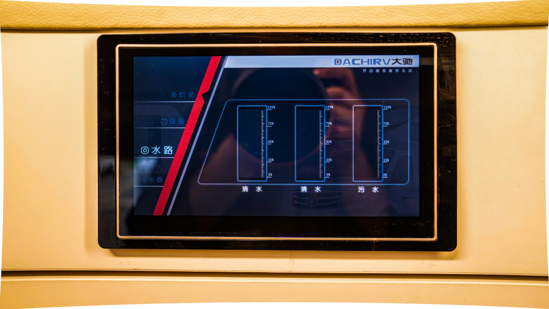 房车用水配备:185L净水箱、50L灰水箱、燃油热水系统,房车专用水泵及重力加水口等。
