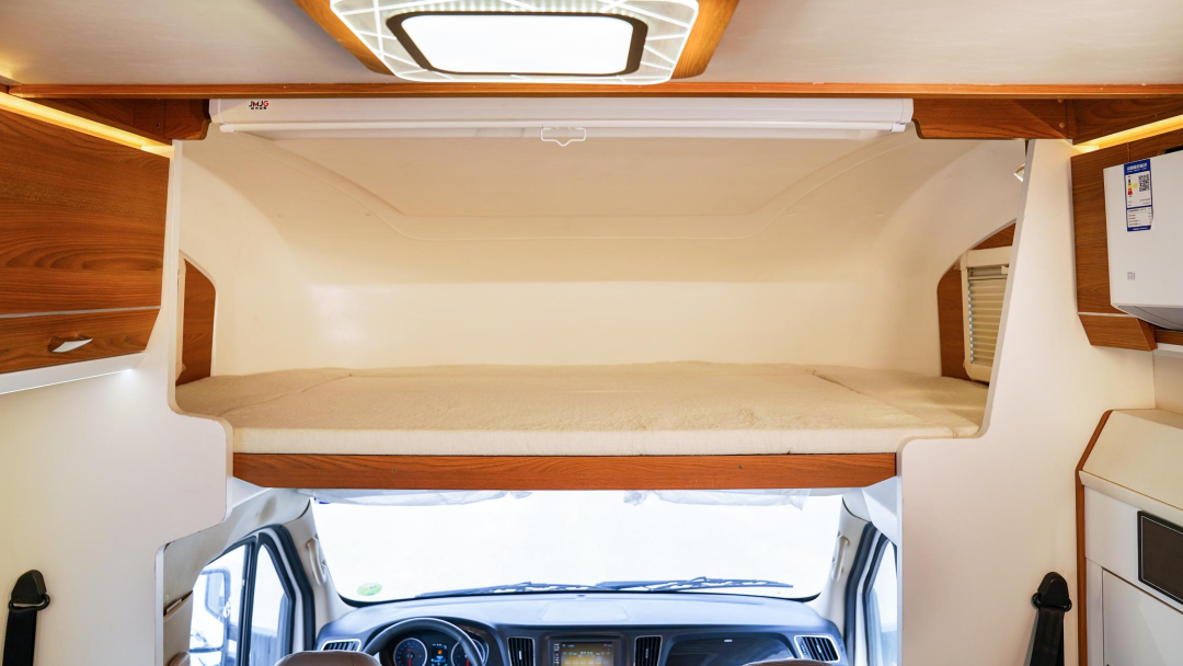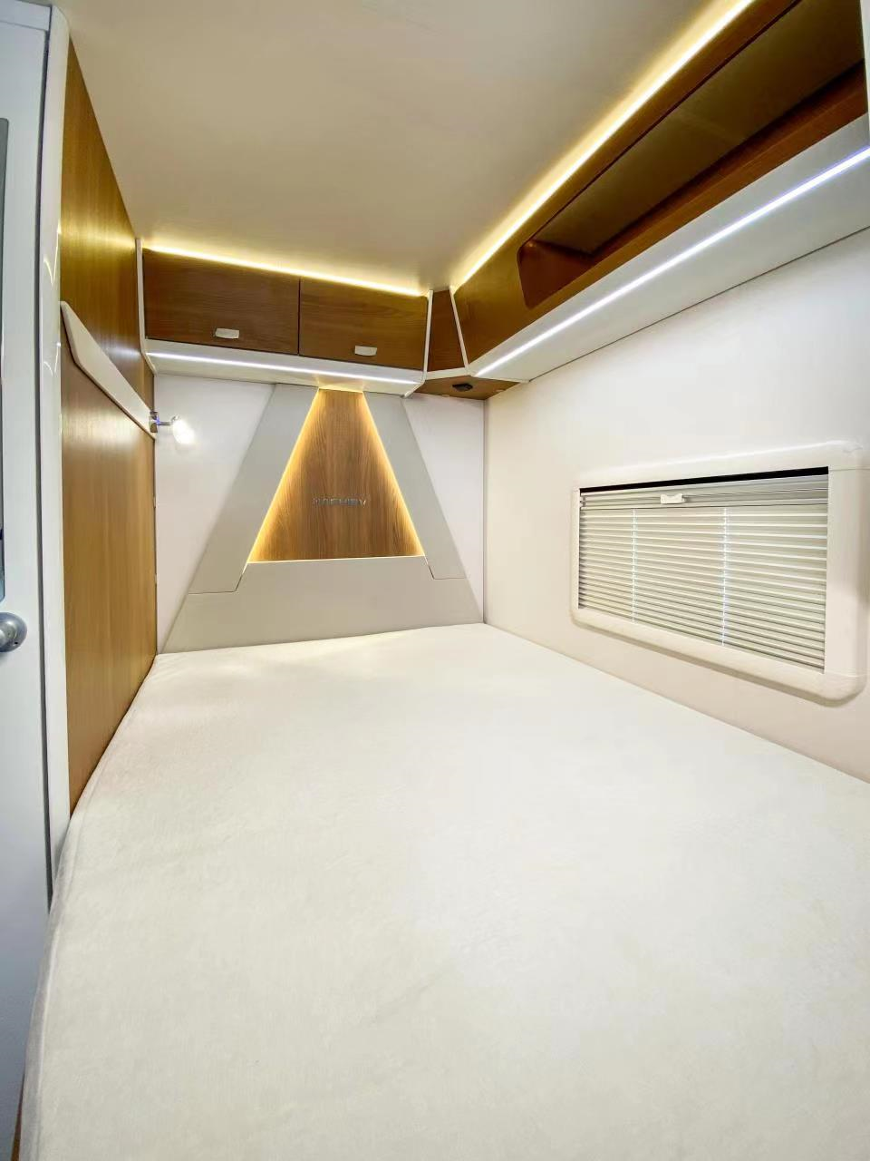 车头顶部标配带爬梯可推拉的双人额头床,床铺两侧均设有通风换气窗,可实时保持车内空气干净清爽。床板下方可选配60寸的投影幕布,为平日的休闲生活提供了娱乐需求。