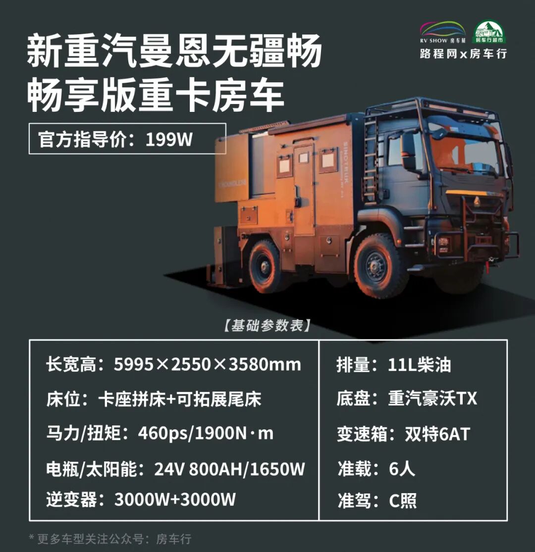 *声明:文中房车车型图片参数来源于新重汽曼恩房车厂家官方;价格、参数仅供参考,不作为实际购车依据,请以官方为准。