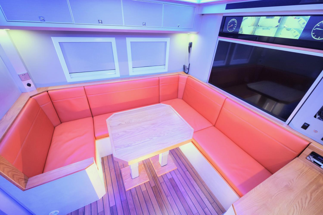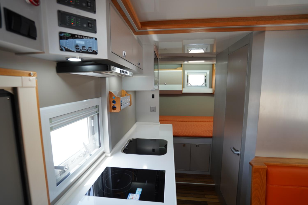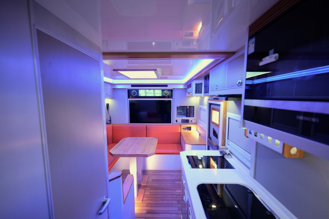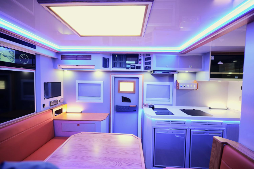 生活区为“前会客厅+中部厨房、卫生间+尾横床”布局,各项功能区配备齐全;内饰采用美国红橡木+游艇专用柚木地板,同时使用日本进口食用级大豆胶粘合,真正做到零甲醛工艺,家具还支持第三方环保检测,达到CMA-GBT标准(家装级国标),营造豪华环保健康的生活空间;暖风热水系统配有特鲁玛COMBI燃油暖风热水一体机、伟巴斯特暖风加热器。