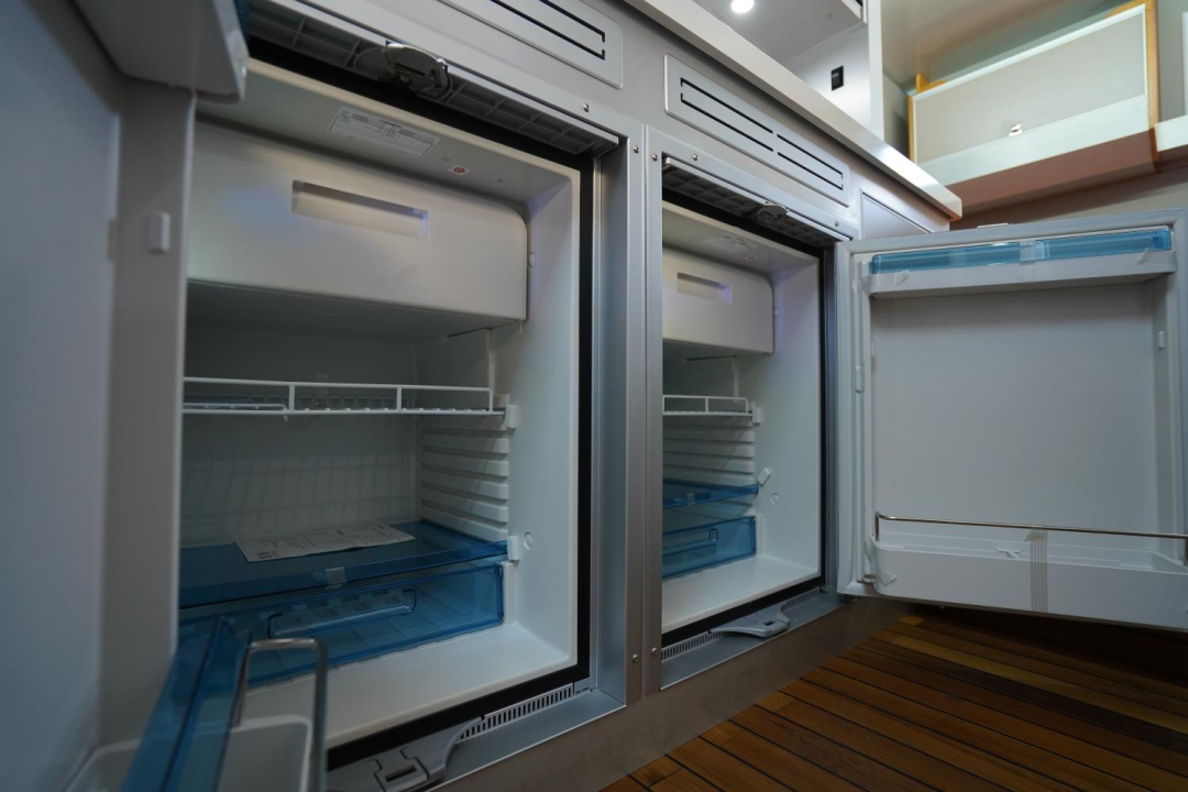 橱柜下方内嵌有2台80L多美达嵌入式冰箱,容量达到了160L,储藏空间丰富,旅行时可以尽情享受冰爽饮料和酒水。