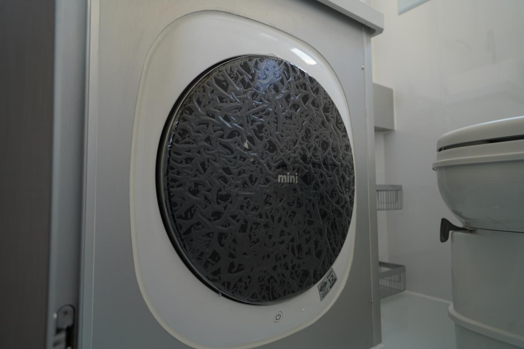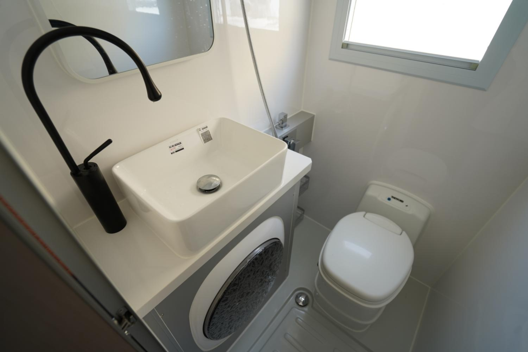 一体式防水卫生间,内部洗手盆、水龙头、赛特福德抽拉式马桶、房车专用节水型淋浴花洒等卫浴、洗漱设施配备齐全;洗手池下方内嵌了一台大宇3KG洗衣机,解决户外洗衣问题。