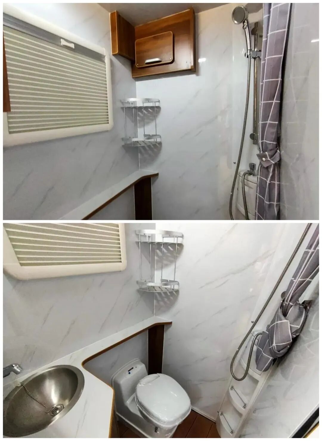 这款车的卫浴间为干湿一体式设计,内部配置了赛特福德电动马桶、洗漱池、淋浴花洒、浴镜、浴帘、置物架、毛巾架、储物柜、置物格、外推窗等设施,充分满足旅居生活中的卫浴需求;
