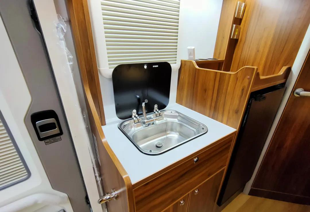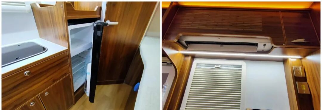厨房区内部配置了盖板式洗菜池、储物柜、抽屉、108L冷藏+冷冻冰箱等设施,考虑到车内做饭油烟过大,同时也为了节省内部空间,这款车内部并没有配置灶具,日常烹饪可以与户外厨房组合使用,足以满足日常烹饪的需求;此外,操作台上方还搭载了一台日本大金1.5P变频空调,冷暖两用,噪音小、耗电少,使用起来相当的舒适;