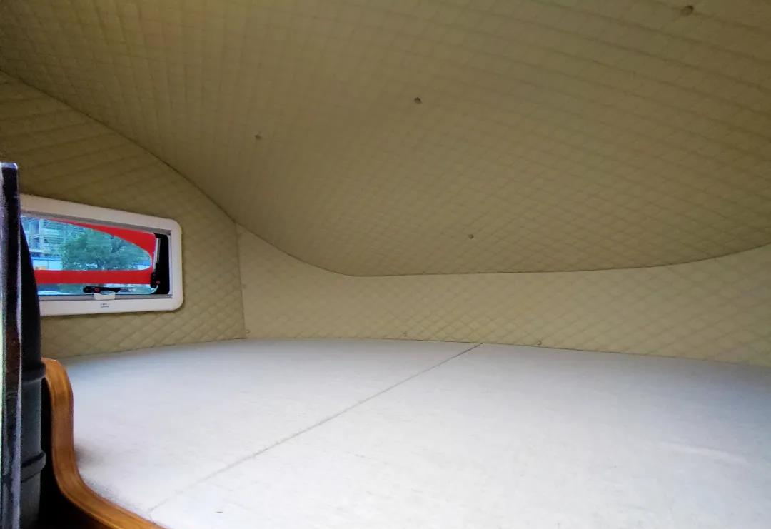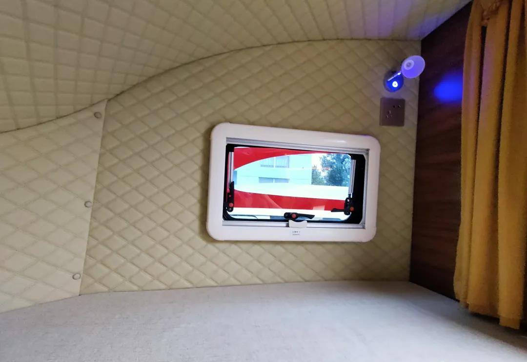 驾驶舱上方为额头休息区,内部配置一张超大双人床可满足多人睡眠的需求,同时为方便上下床,额头侧方配置了一张爬梯;额头床侧方设有隔断帘可保护个人私密空间不被打扰;内部空间充足,配有外推窗加强内部采光、通风的效果,当然,如果你觉得光线不够充足的话,内部还有阅读灯(下方配有插座)可供使用;