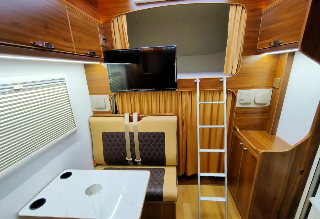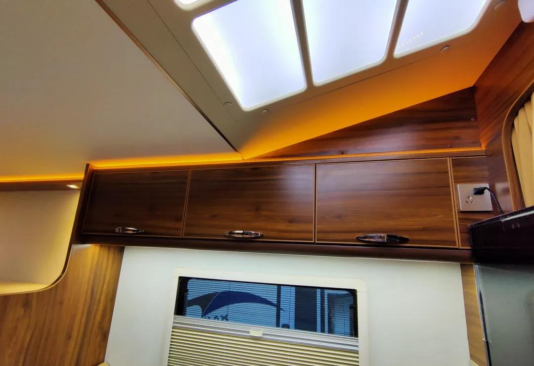 会客区侧方设有外推窗,满足日常采光、通风的需求,行车、驻车时用来观赏风景亦是不错的选择,同时外推窗带有隔断帘与纱窗,使用起来相当方便;会客区上方搭载多组储物吊柜,满足旅居生活储物物品的需求,存放、拿取都很方便;