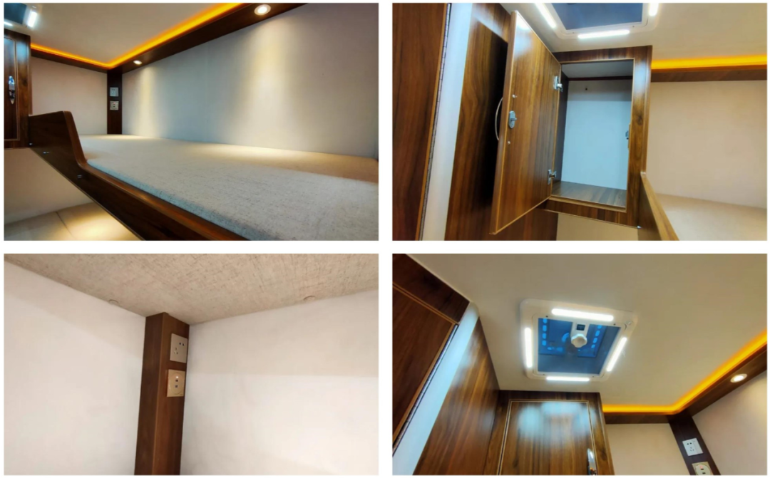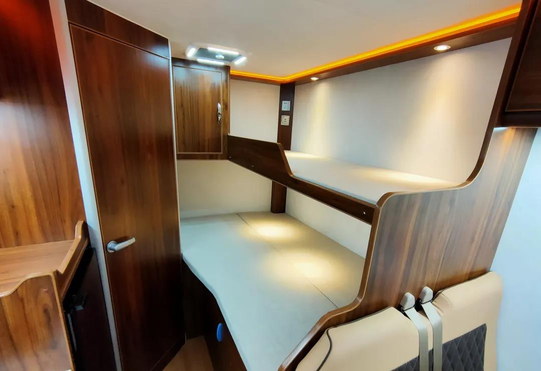 尾部固定休息区纵向放置了一张固定上下铺,充分满足多人睡眠的需求;内部配置了整体式储物柜(与外部连通)、双向换气扇、LED灯带、阅读灯、五孔电源插座、USB接口等多种设施,满足日常休息睡眠的需求;