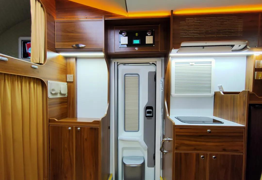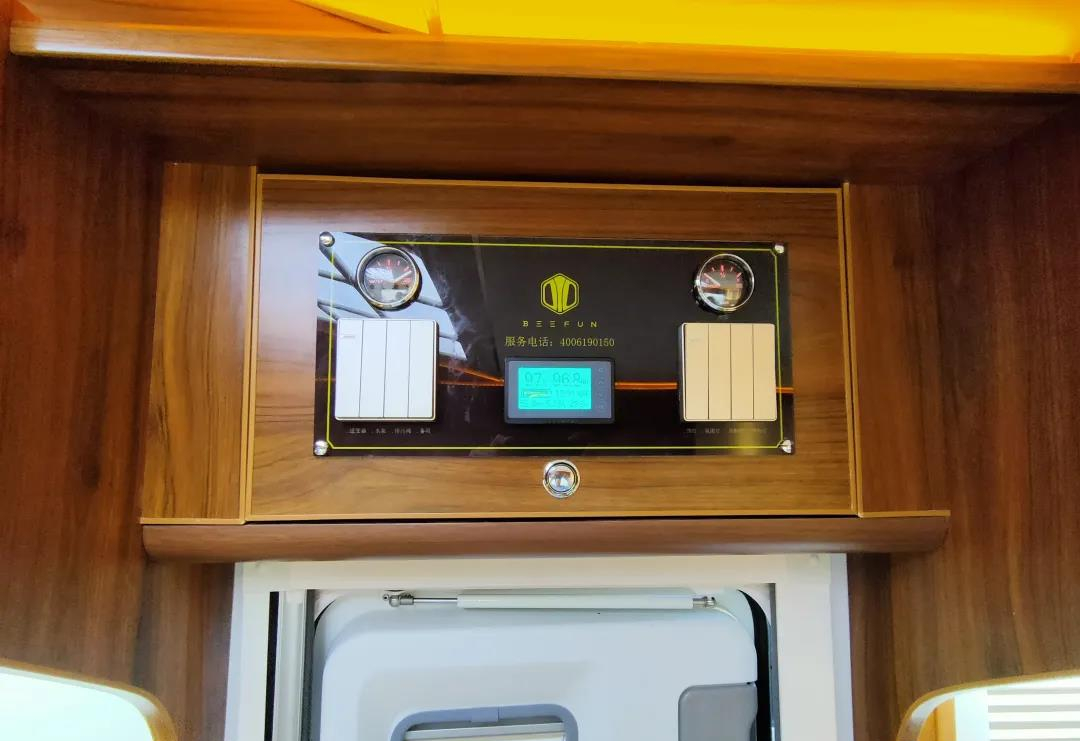 车门上方为中控面板区,车内水电状况一目了然,同时设有独立开关用于控制内部灯光、水电,操作简单,使用起来亦是相当方便;