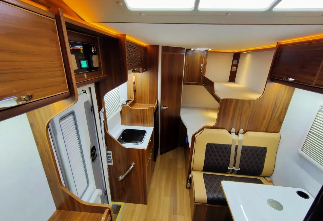 整车在内饰方面选择了简约自然的装修风格,整体看起来沉稳大气、温馨舒雅,即使长久居住也不会产生压抑的感觉;内部各功能区规划合理,厨房、会客、卫浴等各功能区都有配备,齐全的设施,丰富的配置,充分满足日常旅居生活所需;