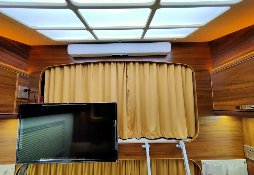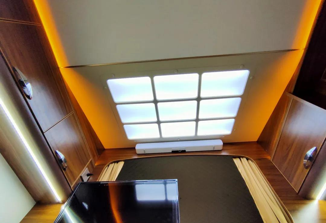 贯通式的设计可以直接从驾驶舱进入车厢生活区内,人性化的设计极大方便了日常进出,内部生活区主体采用棕色板材,顶部搭配暖黄色氛围灯,整体营造一个温馨舒适的居住氛围;驾驶舱尾部设有隔断帘用于保护个人隐私;隔断帘上方搭载一台32寸的高清网络电视,配置了小米盒子,同时匹配电视回音壁影音系统,用于日常休闲娱乐还是相当不错的;