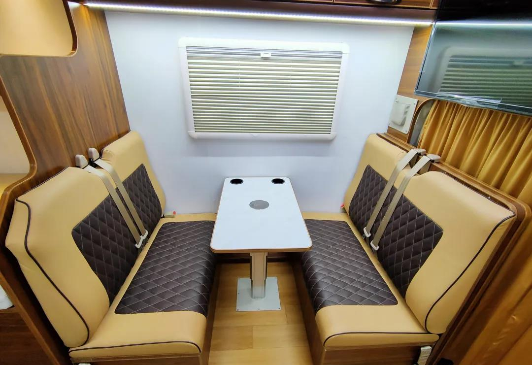 会客区位于车内左侧区域,内部配置了四人对坐式卡座沙发,中间设有一张升降式餐桌,充分满足日常休闲会客的需求,此外,沙发与餐桌在驻车时可根据需要临时组合成床,可供儿童睡眠使用,睡眠空间进一步增加;