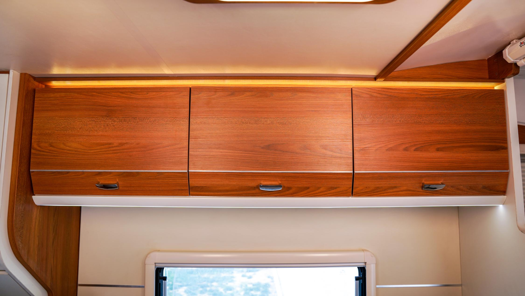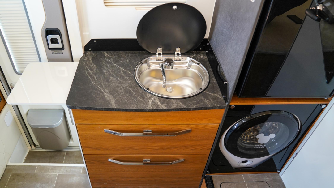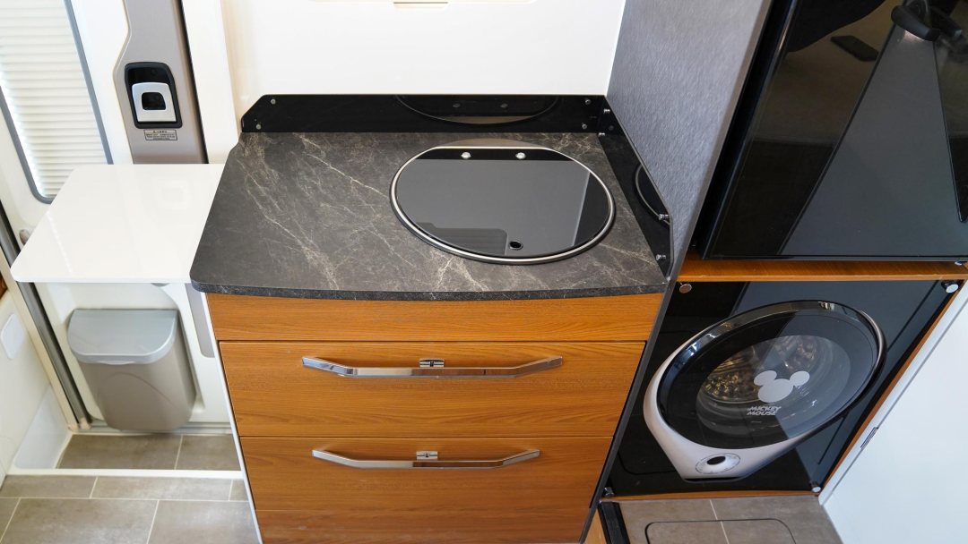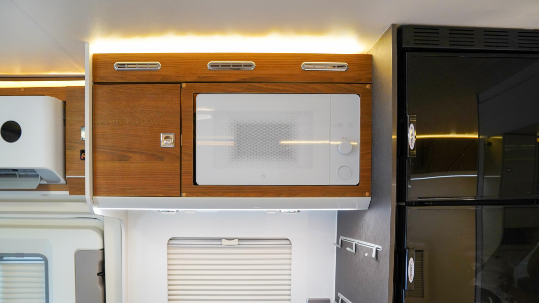 橱柜上方是储物吊柜,内嵌有一台20L微波炉,侧面还有一些储物空间;担心室内烹饪油烟问题的车友,可以在吊柜底部选装房车专用外排式吸油烟机。