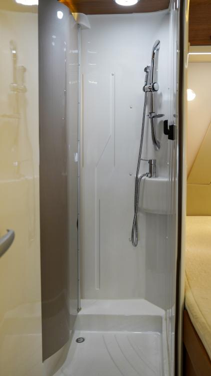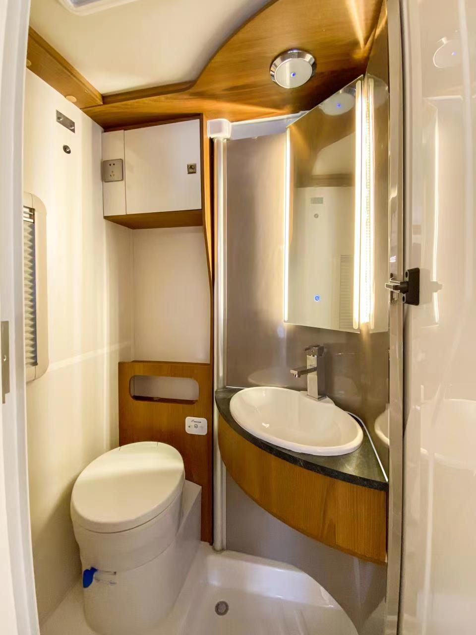 卫生间采用ABS一体成型整体式设计,防水性好,同时容易清洁,淋浴空间还有独特的可旋转设计,达到了干湿分离的效果;淋浴间洗手池和化妆镜集成的面板可以旋转,旋转后形成独立的浴室,使用起来更方便;洗漱卫浴方面洗手池、Freucamp盒式马桶、毛巾架、排气扇等设施配备齐全。