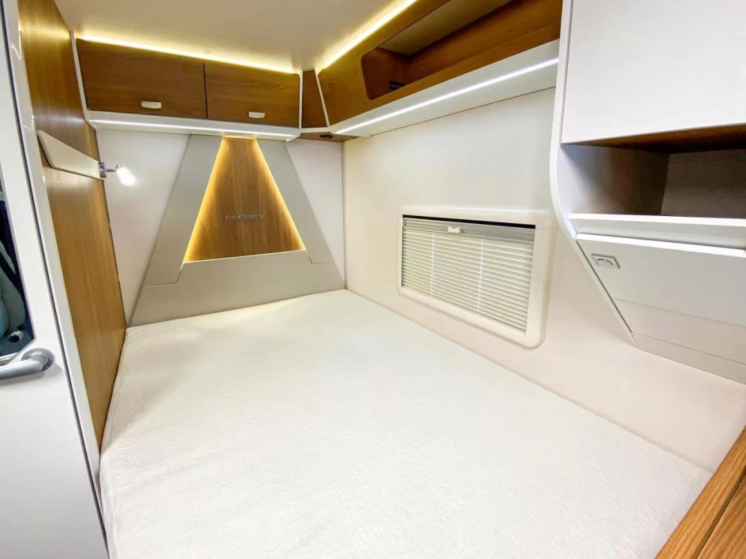 尾纵床尺寸为1850x1250mm,可容纳多人睡眠休息;储物方面设置了L型储物吊柜,和会客厅之间的隔断空间也做了储物柜,充分利用了车内空间;侧面车窗、隐私帘、阅读灯配备齐全,满足睡眠空间照明、通风等需求。