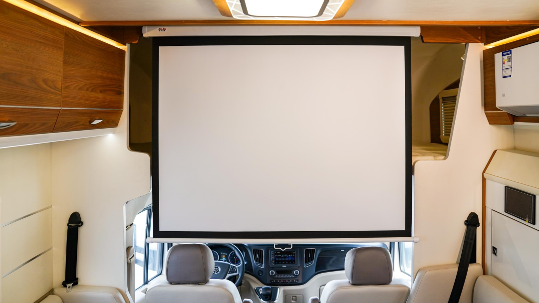 额头休息区设有可推拉双人床,尺寸为1460x2250mm,睡眠空间宽敞舒适,两侧设有车窗保证空间的采光通风;床侧可选装投影仪+投影幕布,为旅行生活带来沉浸式的观影体验。