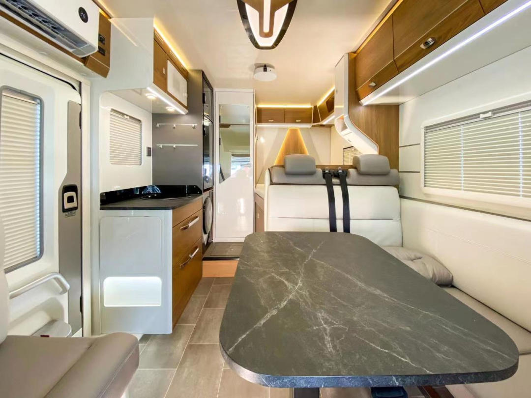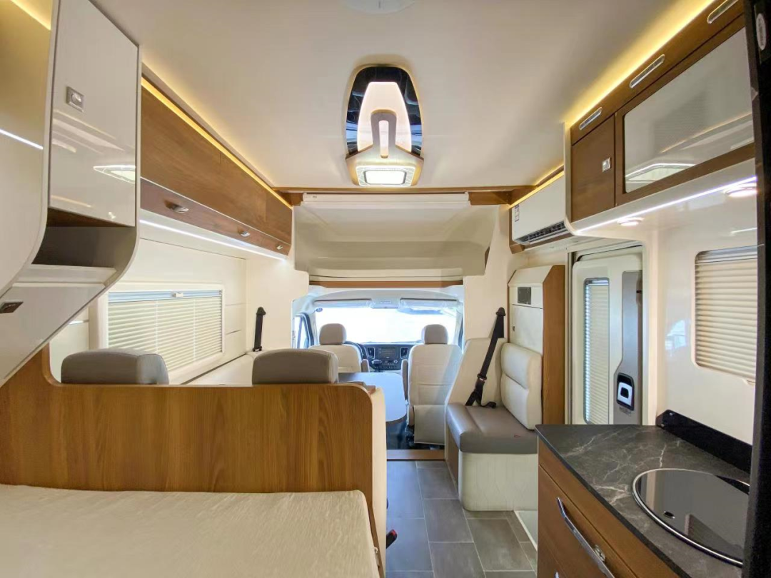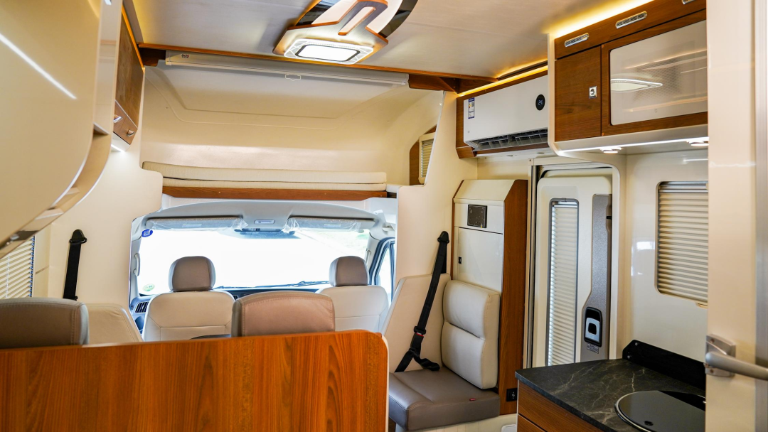 生活区是C型房车常见的尾纵床布局,设置了“额头床+卡座拼床+尾纵床”三处休息区,整体的休息空间非常丰富;内饰采用轻质环保家具,不仅减轻了车身重量,也符合绿色健康的生活理念;车内还配有空调系统、柴暖系统,提供热水和适宜的温度环境。