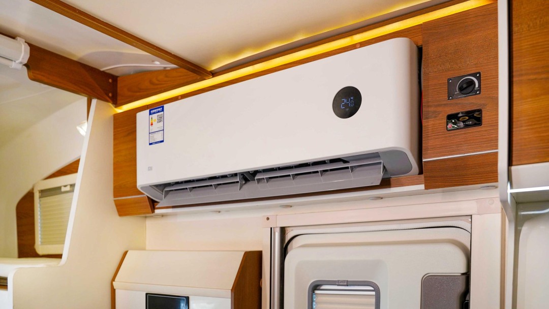 卡座对侧还有一张单人座椅,行车时也可以乘坐,顶部是驻车冷暖变频空调,用于调节车内温度。